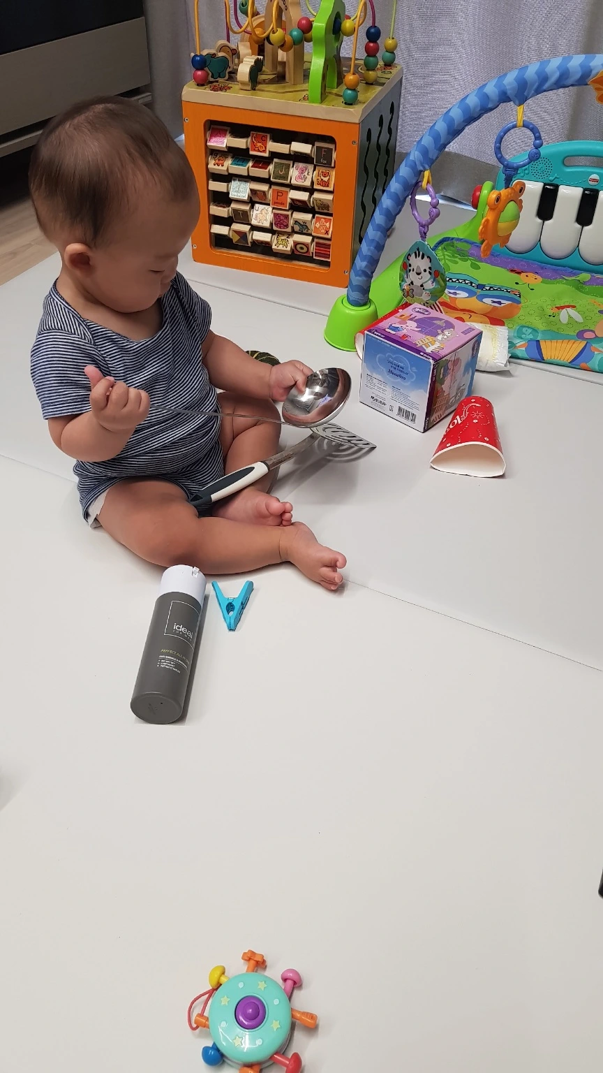 앉음마가 가능해지고 소근육이 발달하면서 일상생활의 모든 것들이 놀잇감으로 변신할 수 있게 되었다. 이 때 당시 아들은 부엌까지 기어가서 서랍에 있는 주방도구를 꺼내서 노는 것을 좋아했다. 특히 스테인리스 재질로 된 물건에 깊이 관심을 가지기 시작했는데 직접 물고 빨고 만져보면서 가재도구를 탐색하는 모습이 인상적이었다. 이 무렵 '아기 체육관'에 대한 관심은 시들고 'zany zoo'라는 놀잇감에 깊이 빠져있던 시기이다. 나무 장식들을 빙글빙글 돌리거나, 구슬 장식을 주어진 라인에 맞추어 이리저리 움직이면서 사물에 대한 판단력을 스스로 기르던 시기였다. 특히 이 놀잇감은 앉아서도, 일어서서도 할 수 있기에 신체 능력 향상에도 제법 도움을 많이 받았던 것으로 기억한다.