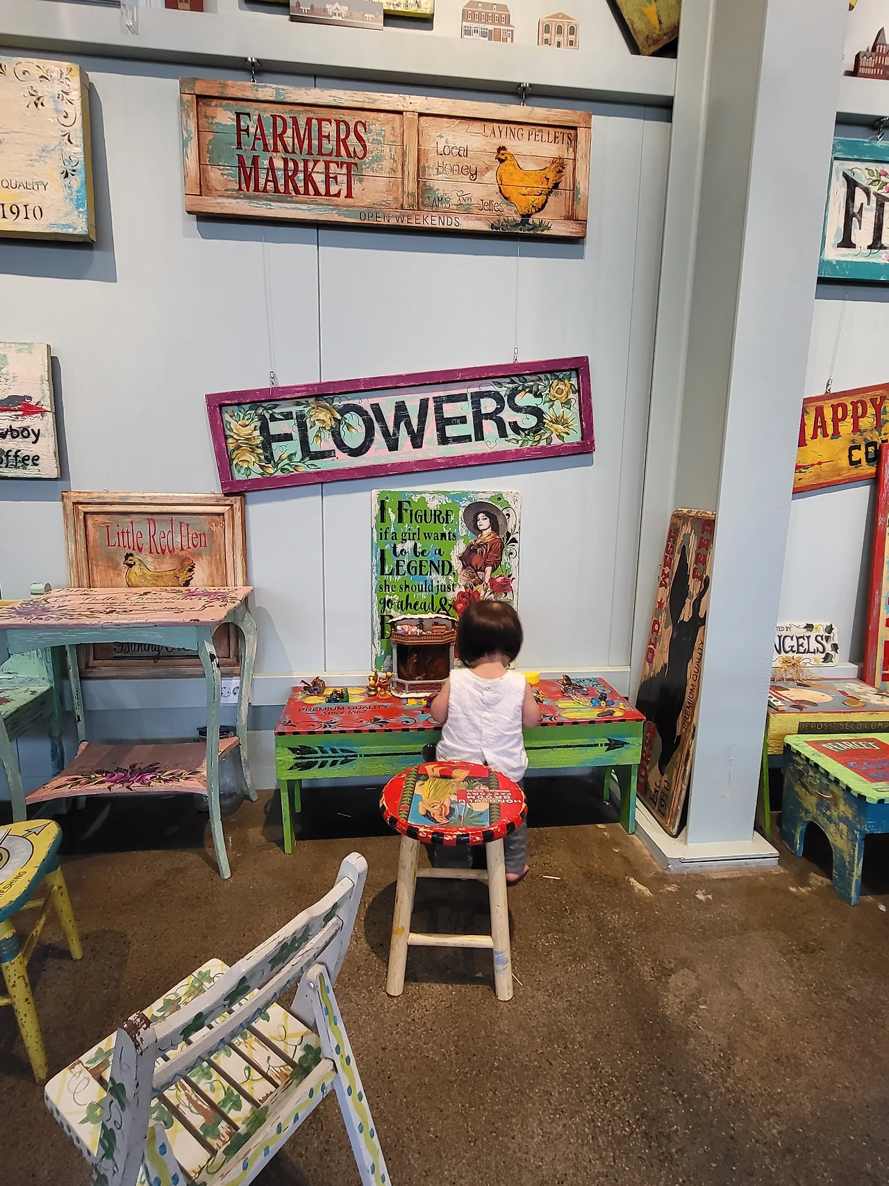 콘셉트는 약 100여 년 전 경제 대공황 이후 뉴딜정책을 위시한 미국의 산업화 시대를 배경으로 한 듯했다. 농업, 공업, 제조업, 축산업 등을 광고하는 빈티지한 광고문구와 제품 홍보물로 가득한 곳이었다. 첫째 아들은 쉐보레사와 포드사의 대표 자동차들 피규어에서 눈을 떼지 못했고 둘째는 아기자기한 액세서리와 알록달록한 모형들에게 큰 관심을 보였다. 그렇게 아가들의 모습을 보며 한편으로 카페를 수놓고 있는 장식품들에 감탄하고 있는 사이, 와이프가 주문했던 빵과 커피를 받아왔고 우리는 미리 맡아두었던 '글램핑 존'으로 이동했다.