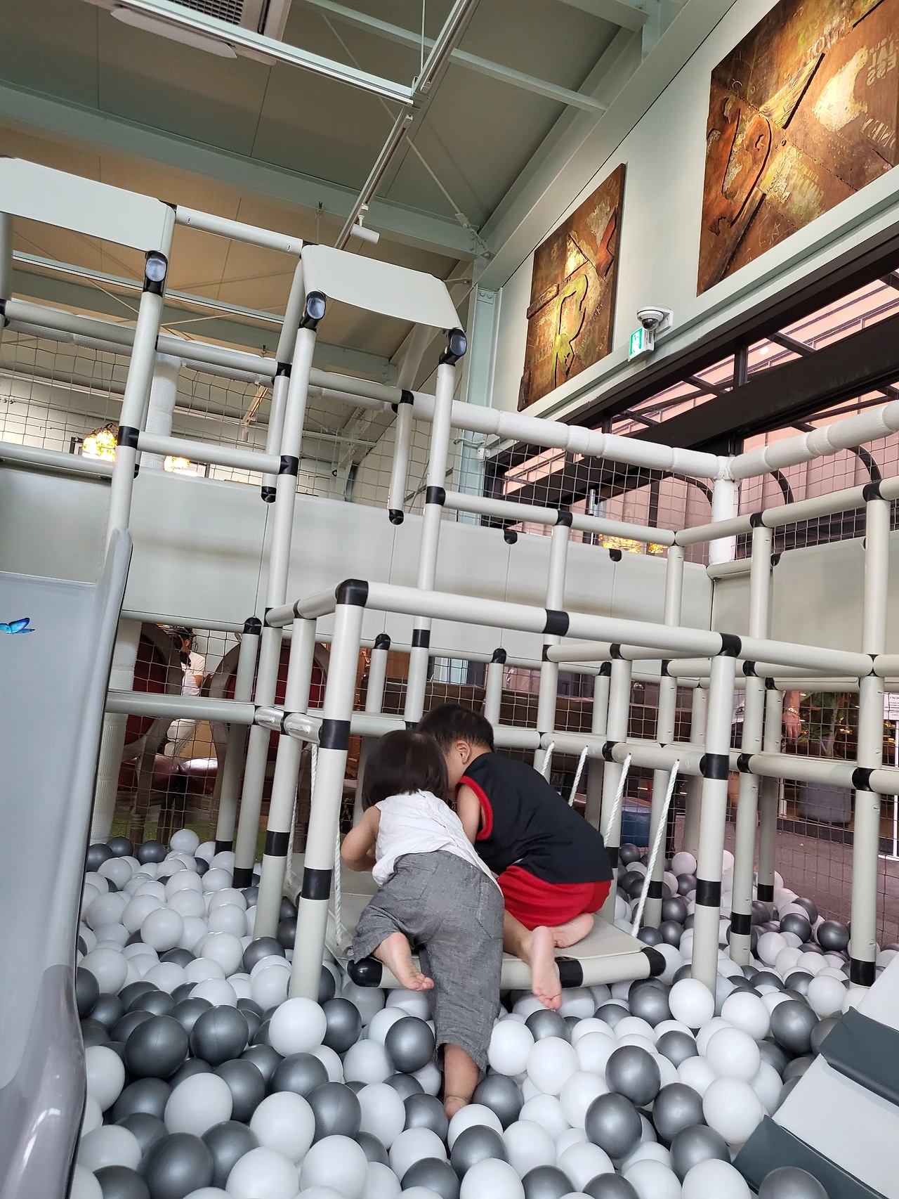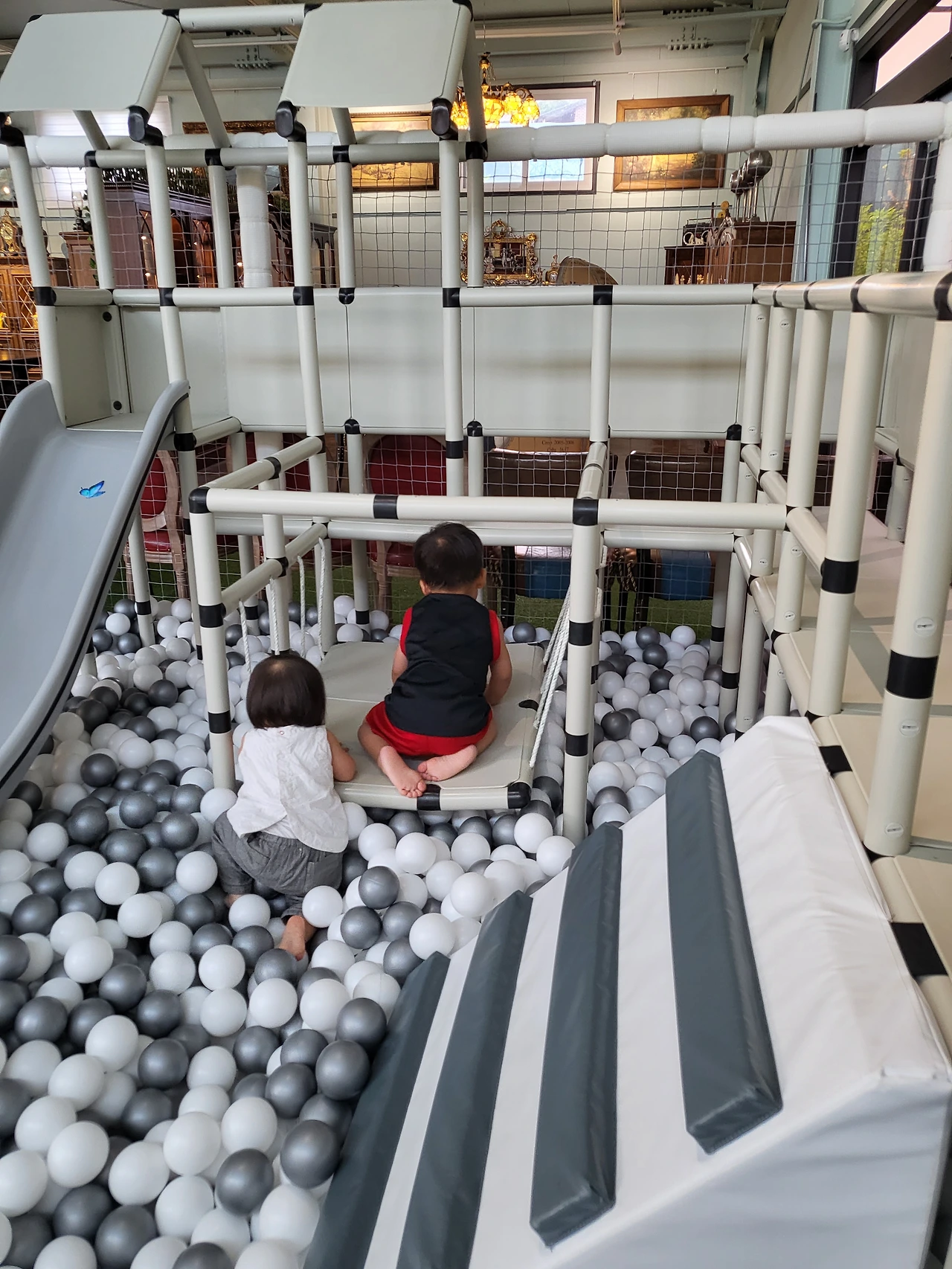 카페 한쪽에 키즈카페에서 많이 볼 수 있는 조그마한 놀이 공간이 있어 아가들과 함께 이용했다. 같이 놀고 있는 아이들을 쭉 훑어본 결과 우리 아가들이 또 거의 막내급인 듯하다. 혹시라도 놀다가 다칠까 봐 늘 그렇듯이 눈에 쌍심지를 켜고 아가들이 노는 모습을 곁에서 지켜보았다. 아가들은 그동안 엄마아빠를 따라 다양한 콘셉트의 키즈카페를 이용했던 값을 톡톡히 하는 것 같았다. 왜냐하면 처음 보는 기구와 장치들을 쓱 보고 어떻게 놀아야 하는지 정확하게 파악하고 즐겼기 때문이다. 그렇게 수많은 선배들(?) 사이에서도 다치지 않고 즐겁게 아가들은 땀을 뻘뻘 흘릴 정도로 열심히 놀았고 2시간가량의 카페에서의 활동은 그렇게 마무리되었다.