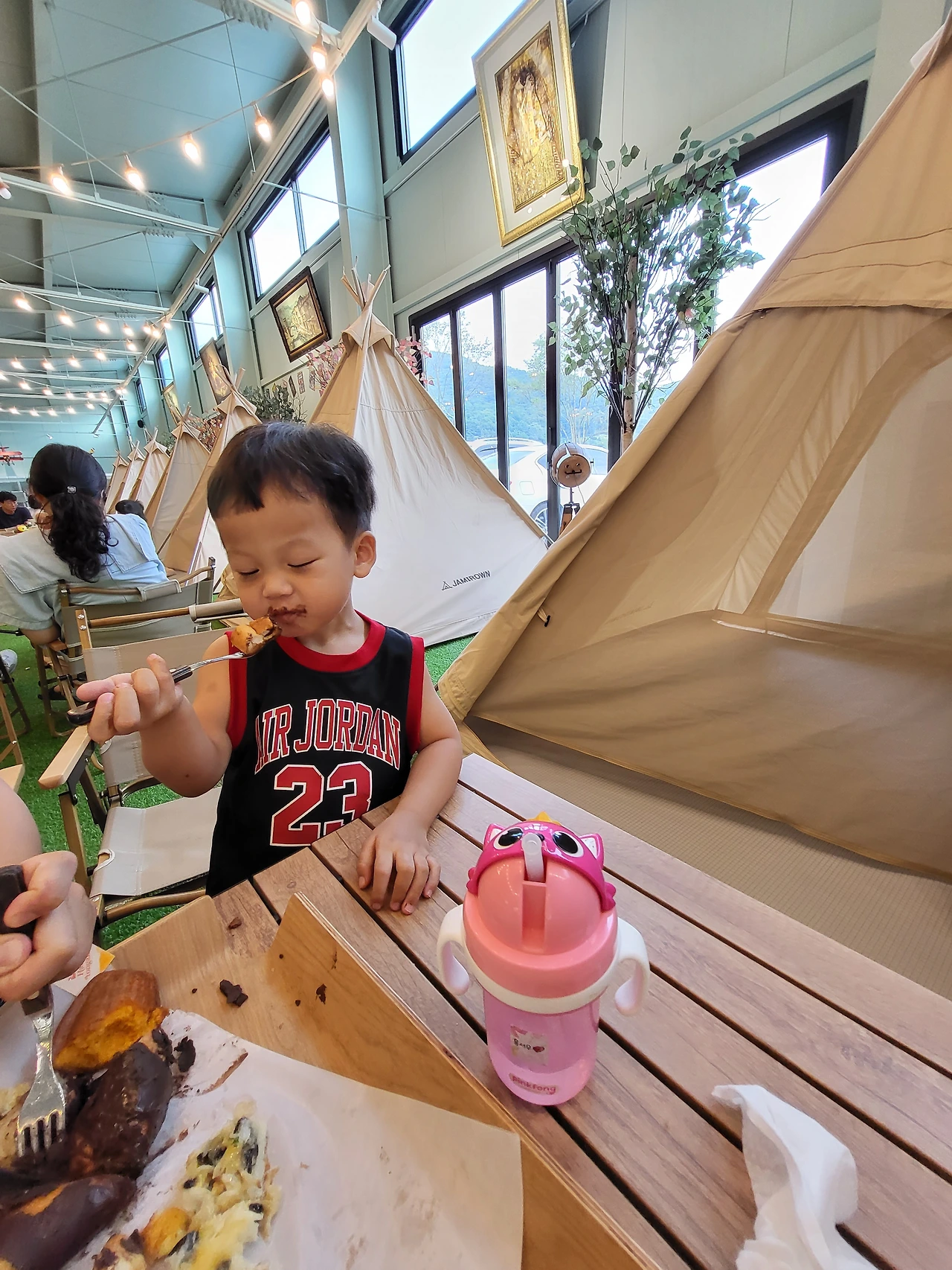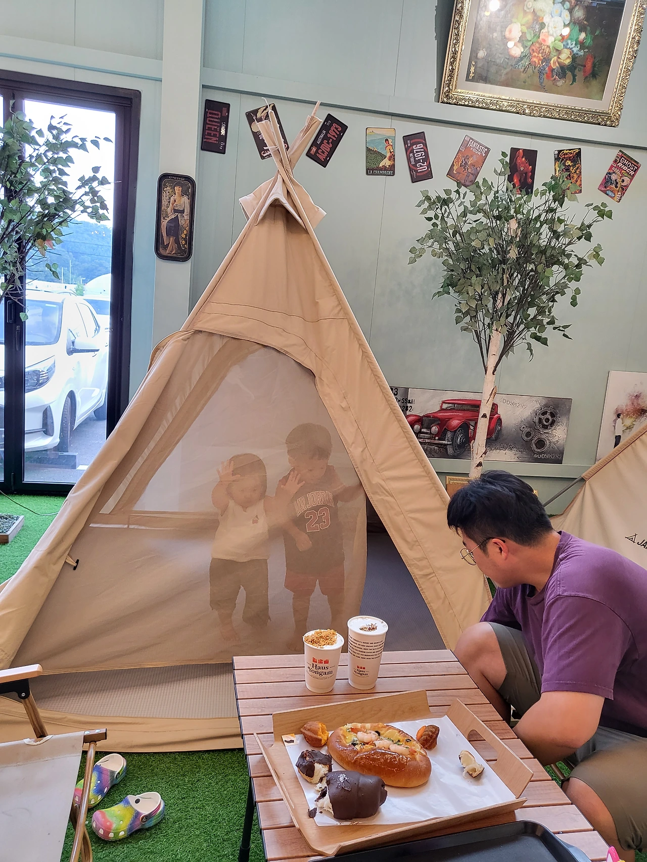 뙤약볕이 아닌 실내에서 이렇게 글램핑 문화를 간접적으로 체험해 보는 것은 꽤 괜찮은 경험이라 생각했다. 글램핑을 언제 처음이자 마지막으로 해보았더라. 아가들이 좀 더 크면 본격적인 캠핑을 해 봐야지라는 다짐을 해 본 순간이다. 빵과 커피는 특색이 있긴 했지만 그렇게 맛있다는 생각은 안 들었다. 그저 이 공간을 즐기는데 들어가는 데 필요한 입장료라고 생각하기로 했다. 그래도 아가들은 공간이 주는 분위기와 가족 단위의 손님이 왁자지껄하게 발산하는 에너지가 꽤 마음에 들었는 모양이다. 생전 처음 보는 텐트를 수시로 넘나들고 뒹굴거리며 놀았다. 우리와 입맛이 비슷한 아가들도 빵은 한 두 입 먹고 말아 버렸지만 말이다.