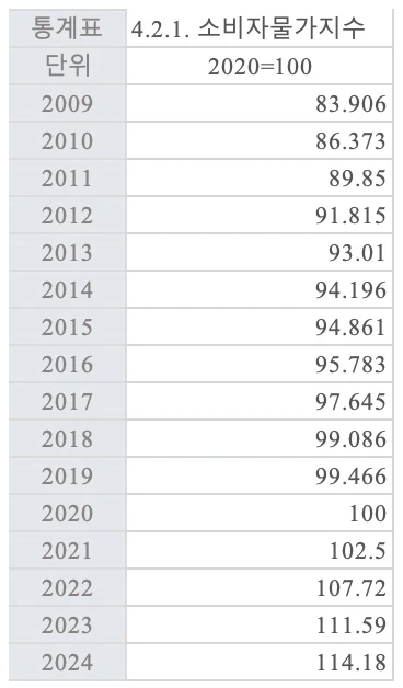 16년간의 물가상승률을 살펴보자. 2009년에 비해 2024년 소비자물가지수는 1.4배이다.