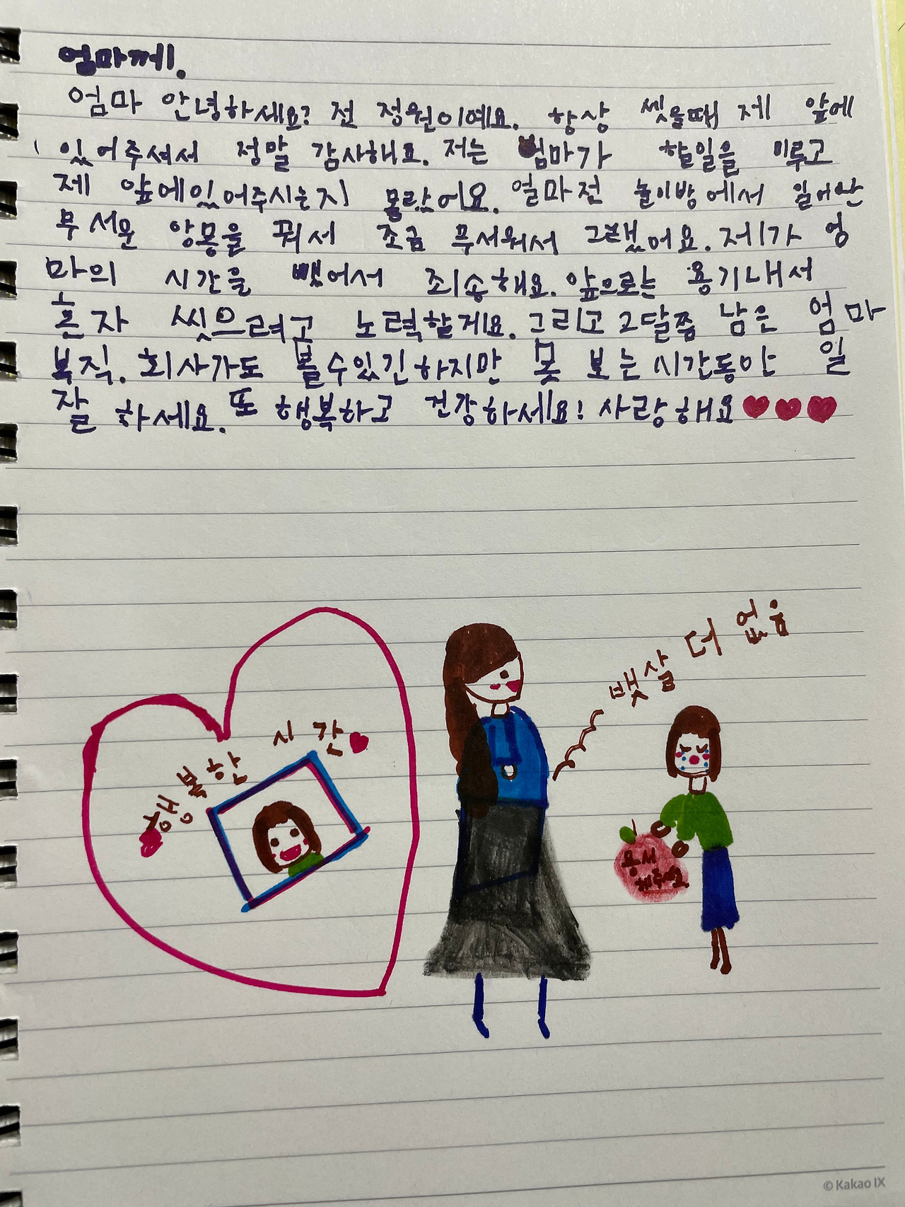 그래도 다짐한 바가 있으니 짜증을 최대한 감추었다. 말없이 저녁 준비를 하는 동안 아이는 한참동안 책상에 앉아 무언가에 몰두했다. 그러더니 말없이 엄마에게 교환일기장을 내밀었다. 아이들과 꾸준히 화내지 않고 대화하기 위한 방법으로 하루에 있었던 일을 일기장에 서로 편지형식으로 써서 나누자고 제안했었다. 아이는 교환일기장에 내 시간을 뺏은 줄 몰랐다며 사과했다