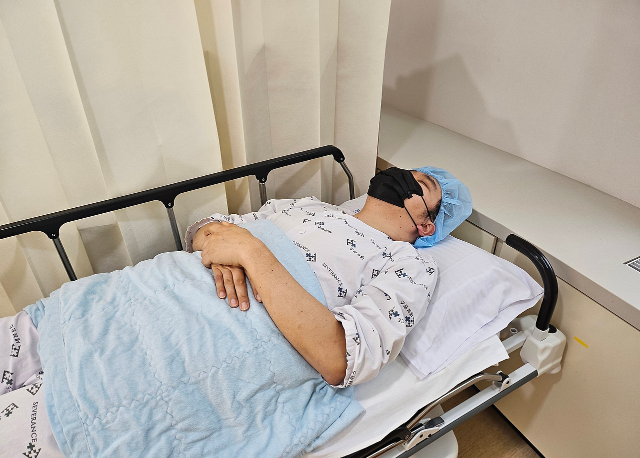 시련은 여기서 끝나지 않았다. 막 전공의 파업이 시작되면서 남편의 전신마취를 담당해 줄 의사선생님을 구하지 못했다. 교수님은 미루면 우리만 힘들어질 거라며 부분마취를 권유했다. 마스크라도 벗고 들어갈 수 없냐고 물었지만 안구의 위생문제로 불가했다. 다시 마스크 위에 수술포, 남편의 암담한 표정이 눈에 보였다. 나는 급한대로 청심환과 마스크 가드를 사 왔다. 숨이 멎을 거 같다는 그 공포에서 조금이라도 해방되길. 아내로서 내가 해줄 수 있는 게 너무나도 없었다. 남편은 그렇게 또 수술실로 들어갔다.