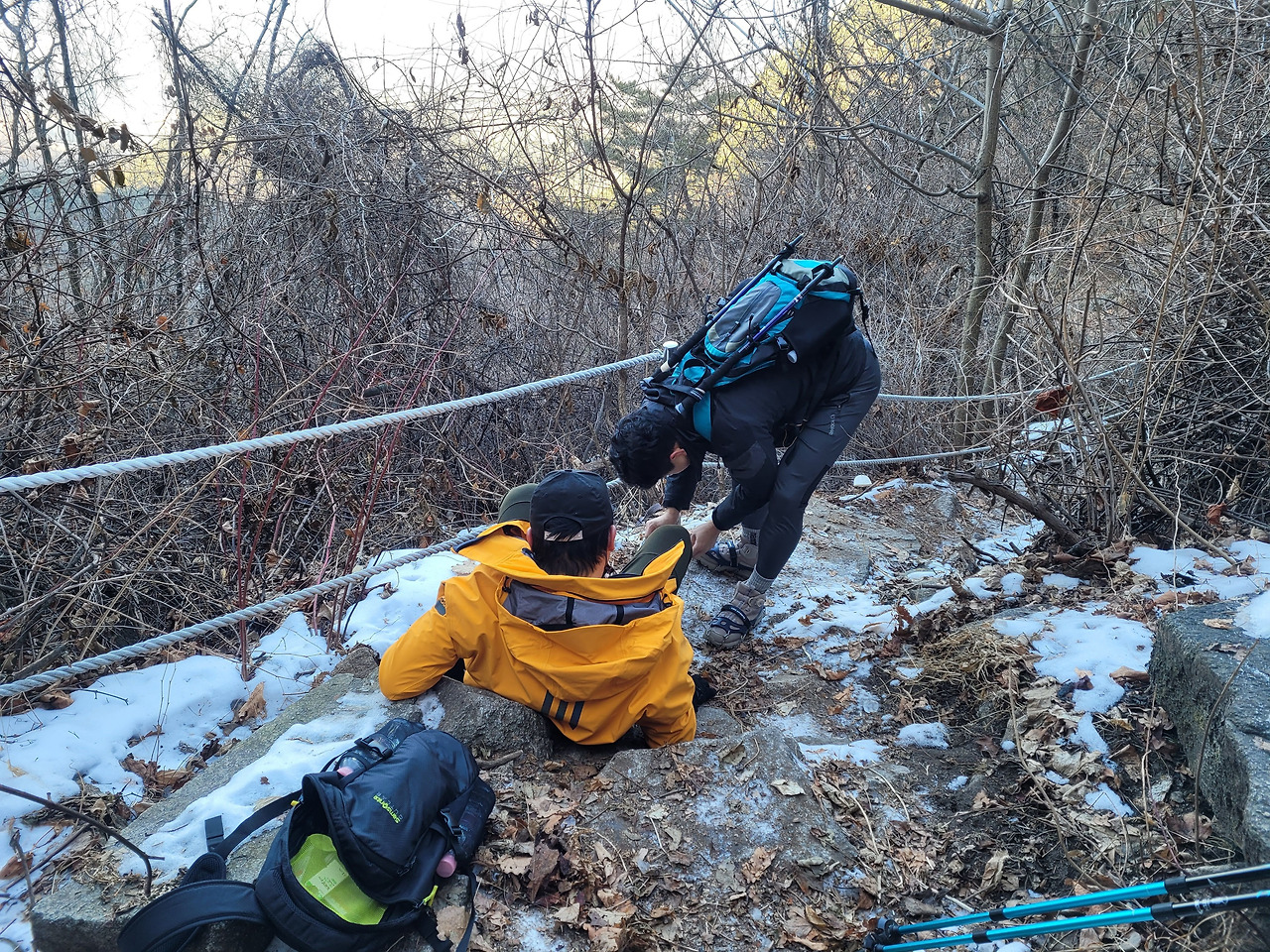눈이 다 녹지 않아 빙판길이 되어버린 운악산을 오른 적이 있다. 20대 때부터 아빠를 따라 등산을 몇 번 다녀봤지만 이런 설산은 처음이었다. 남편은 유산소 운동과는 담을 쌓고 살아온 사람이었다. 그런 남편에게 '건강해지려면 운동해야지'라는 말로 채찍질을 해서 산으로 데려갔다. 어떻게 신는 건지도 몰랐던 포장도 뜯지 않은 아이젠을 무기 삼아 오르기 시작했다. 너무 미끄러우면 그때 차야지, 그럼 아무 문제없을 거야. 남편은 나보다도 산이 낯선 사람이었다. 얼마 오르지도 않았는데 숨소리가 거칠어졌다. 자꾸 멈추려는 남편의 팔을 잡아끌면서 산을 오르고 또 올랐다. 이때까진 잘 몰랐다. 설산을 내려온다는 게 얼마나 위험한 일인지. 아이젠을 신어야만 건너갈 수 있는 구간이 나왔다. 남들에게 물어물어 아이젠을 착용했지만 사용해 본 적이 없으니 겁이 났다. 미끄러지는 순간 곧장 낭떠러지였다. 여기서는 서로를 의지해서 갈 수도 없었다.