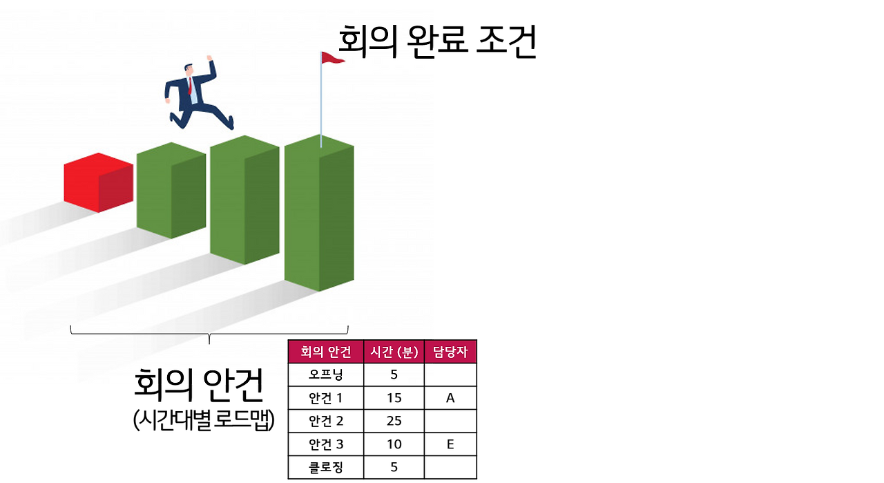 이렇게 질문하면서 지금 ‘논의해도 좋을 사항’과 ‘반드시 논의할 사항’을 구분해 봅니다. Good이 아닌 Must 회의 안건, 즉 필수안건을 파악하는 겁니다. 그런데 60분 안에 회의를 끝내려면 이 안건이 총 3가지를 넘지 않는 것을 추천해요. 1시간 안에 명확한 목표에 맞춰 한정된 안건을 밀도 높게 논의하는 것이지요.