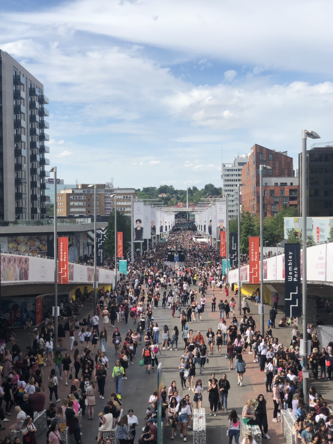 BTS 월드투어 콘서트가 이틀 동안 진행되었던 웸블리 스타디움 주변은 말 그대로 축제의 현장이었다. 이미 세계 각국의 언론사에서 취재를 나와서 관객들을 대상으로 인터뷰를 진행하고 있었고, 길거리 곳곳에서는 BTS 뿐만 아니라 각종 K-POP 노래들이 흥겹게 흘러나오고 있었다. 그리고 노래에 맞춰 소녀들이 그룹을 지어 춤을 추고 이들을 둘러싸고 호응해 주는 다른 관객들의 모습을 무척 재미있게 지켜보았다. 한국어가 이들에게는 꽤나 어려울 텐데, 이렇게 행복한 얼굴로 노래를 부르며 춤을 추고 신나하는 모습을 보니 괜히 내 어깨가 으쓱해지기도 했다. 그리고 신기했던 또 한 가지는 경기장을 찾은 관람객 층이 꽤나 다양했다는 것이다. 보통 K-POP 공연의 경우 10대~20대 청년들이 주를 이룬다고 생각했었는데, 이 공연에서는 가족 단위로 구성된 관객을 정말 많이 보았고, 남성 팬들도 엄청 많이 보였다. 그리고 노년층의 관객들도 군데군데 보였었는데 손자나 손녀를 따라 공연을 보러 왔겠거니 했는데 할머니와 할아버지가 콘서트 도중 멤버들 이름을 부르며 환호하는 모습을 직접 목격하며 정말 깜짝 놀랐기도 했다.