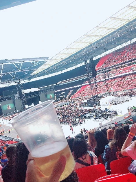 그렇게 주변 광경들을 즐겁게 지켜보다가 시간이 되어 경기장 안으로 들어간 나는 스타디움이 주는 거대한 위압감에 다시 한 번 놀랄 수밖에 없었다. 수만 개의 좌석이 경기장을 둘러싸고 있었고 그 중심에는 엄청난 크기의 무대가 자리잡고 있었다. 공연 첫째 날 그렇게 입을 쩍 벌리며 자리에 앉으니 옆자리에 앉은 영국 소녀들이 나에게 혹시 한국인이냐며 물어봐주었고 어떻게 알았냐고 하니 내가 계속 '대박'이라고 말하고 있어서 한국인이라는 것을 알게 되었다고 웃으며 얘기해주었다. '대박'이라는 단어를 알다니ㅎㅎ 이어서 공연 둘째 날에는 일부러 공연 시작 전 미리 버드와이저를 사가지고 들어가 한 병을 마시고 얼큰하게 취한 채로 공연을 즐길 준비에 임했다.