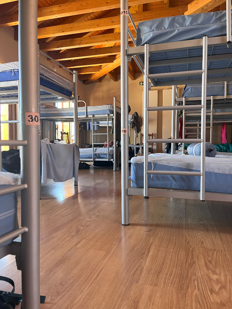 산티아고 순례길에서는 오전 6시에서 8시 사이에 길을 나선다. 그리고 오후 12시에서 2시 사이, 늦으면 3시가 되어야 숙소에 도착한다. 대부분의 숙소는 벙커형 2층 침대가 놓여있는 도미토리 형태로, 많게는 90명의 사람들이 강당 한 층에서 자기도 한다. 철제 또는 나무 프레임의 침대 위에는 영락없이 파란색 비닐 커버가 씌워진 매트리스가 놓여있고, 부직포로 된 일회용 침대시트와 베개시트가 주어진다. 무거운 배낭을 내려놓고 낑낑대며 침대를 정리하고 나면 그제야 씻을 시간이 돌아온다.