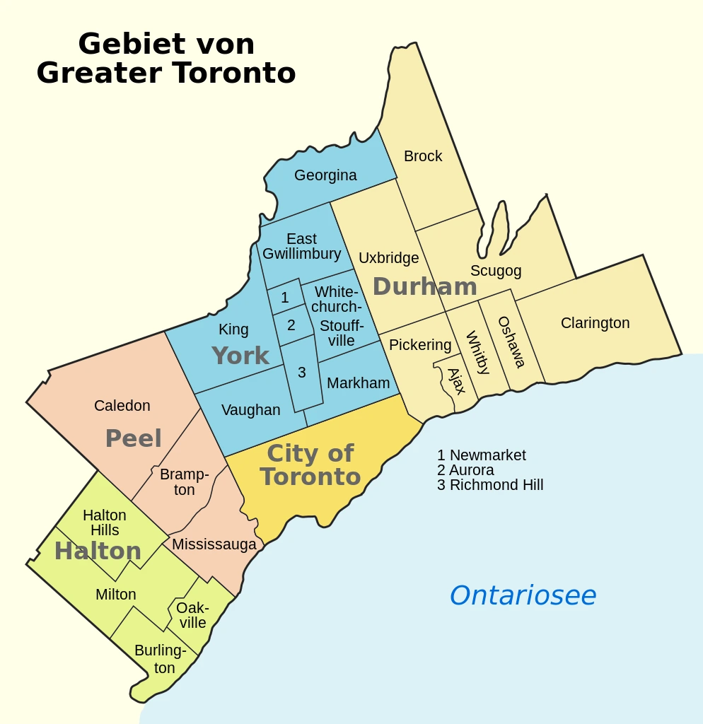 캐나다 온타리오(Ontario) 주에 위치한 광역 토론토 (GTA: Greater Toronto Area)로 불리는 이곳은 아래와 같이 여러 지역들로 이루어져 있습니다.