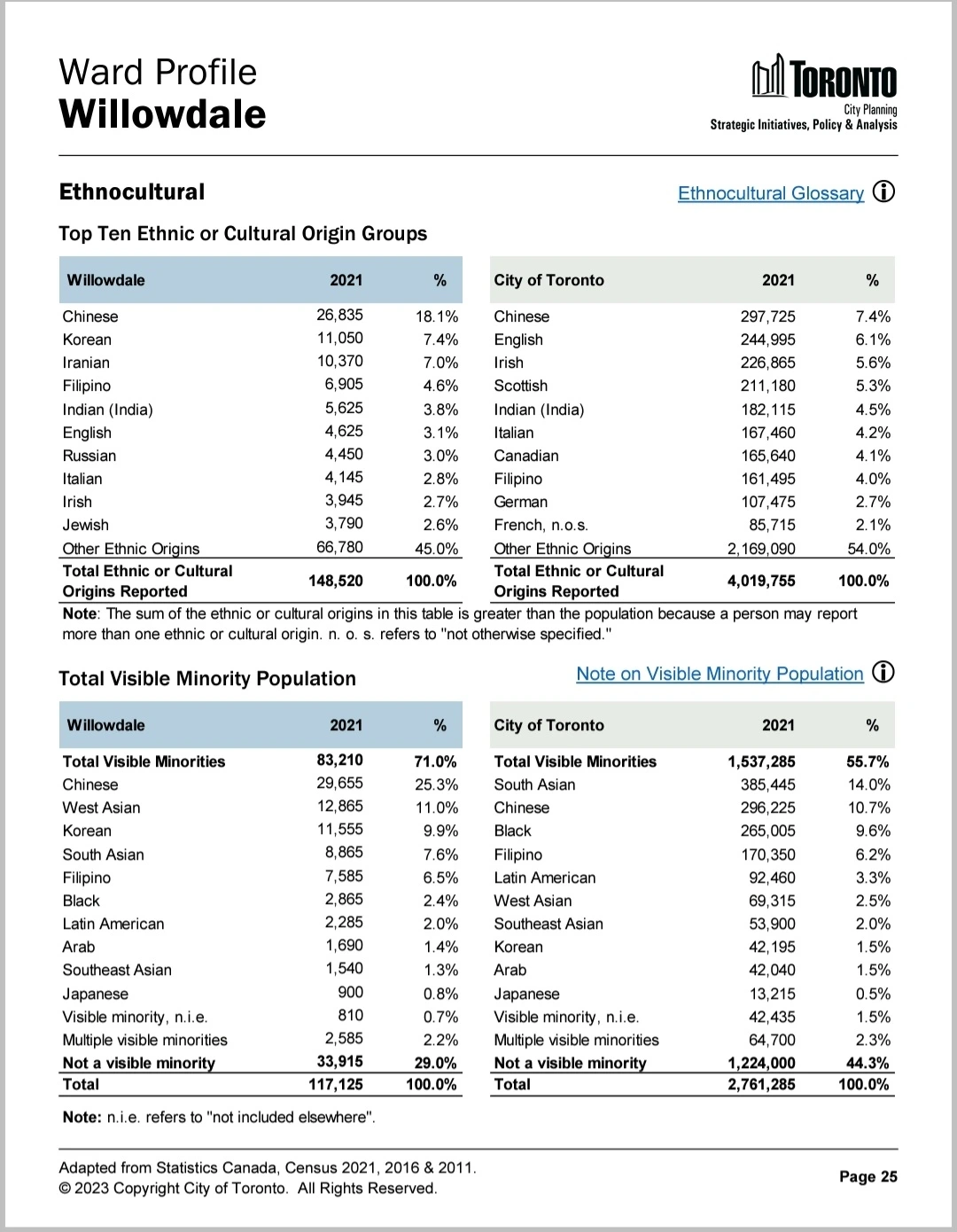민족문화성 (Ethnocultural)을 중심으로 한 통계 부분 중 민족 또는 문화적 기원으로 구분한 조사에 따르면 Willowdale 지역 내 한국인의 비율은 중국인 (18.1%) 다음으로 높은 7.4%를 나타내고 있습니다. 예전에는 이 지역에서 이란인의 비율이 높았었는데 이제는 한국인의 비율이 앞서는 것으로 나타났습니다. 그러나 오른쪽 자료인 토론토시 전체로 하면 한국인이 차지하는 비율은 순위에 나오지 않을 정도로 작아 그 외 기타 부분에 포함됩니다.