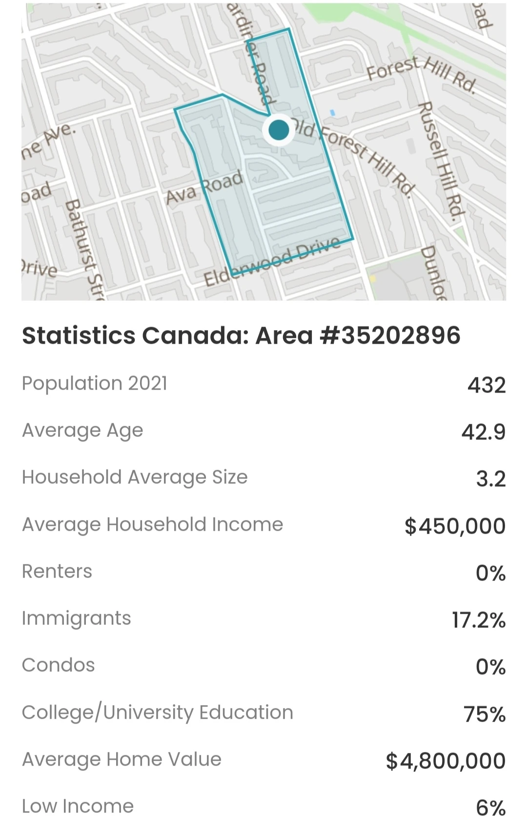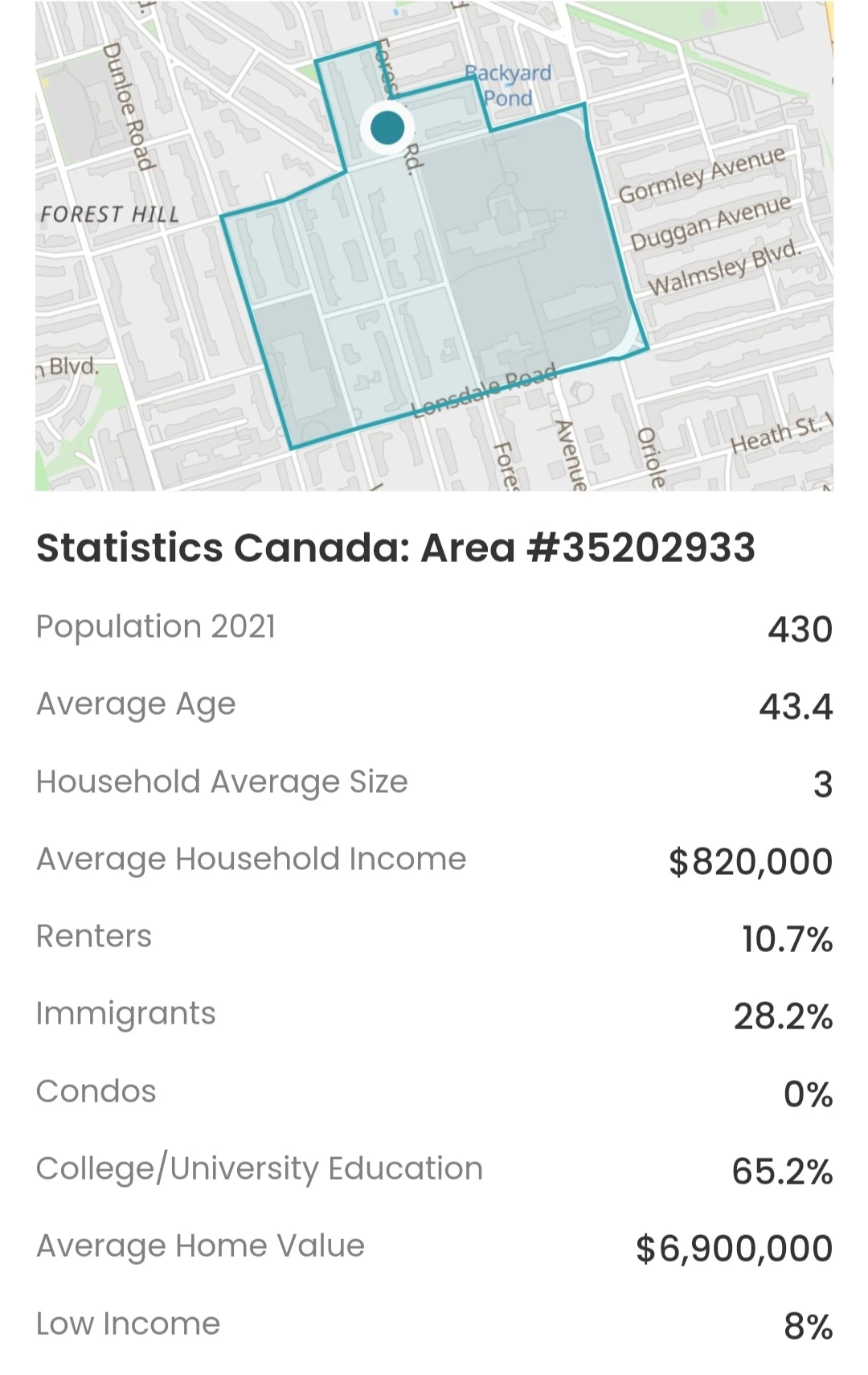 예전에는 하나의 구역으로 되어 있었지만 최근 구역 재배치를 통해 지방 자치 단체는 Forest Hill South와 Forest Hill North의 두 지역으로 분할했습니다. 그중 토론토의 부촌으로 불리는 Forest Hill South 지역에서의 평균 집값은 6.9 million달러, 가구당 연수입은 82만 달러입니다. Forest Hill South가 만들어졌을 때 조례와 건축 법규에 따라 이 지역의 모든 주택은 건축가가 설계해야 했고 그들은 각 건축물 앞에 나무를 심을 것을 요청했습니다. 이 유산은 이 지역에서 지금까지 잘 유지되고 있는 것으로 나타났습니다.