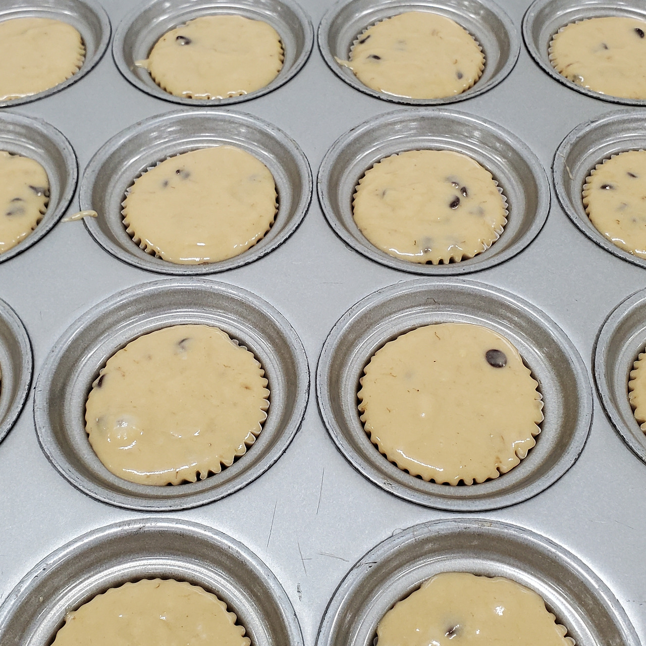 베이킹 팬안의 종이컵에 머핀 반죽 (110g)을 넣은 상태
