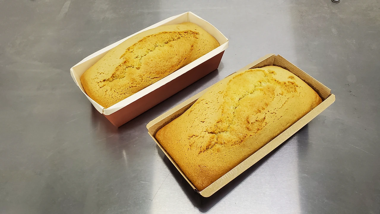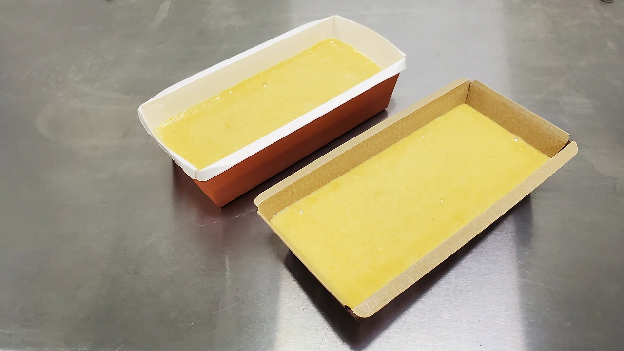 종이 로프팬(Loaf Pan)에 콘브레드 반죽(500g)을 넣은 상태