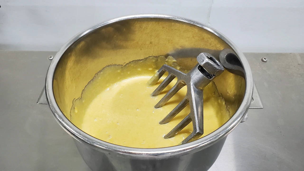 1. 믹싱 보울에 식용유, 달걀, 물, 바닐라, 옥수수 알갱이를 넣고 느린 속도로 1분간 믹싱 합니다.