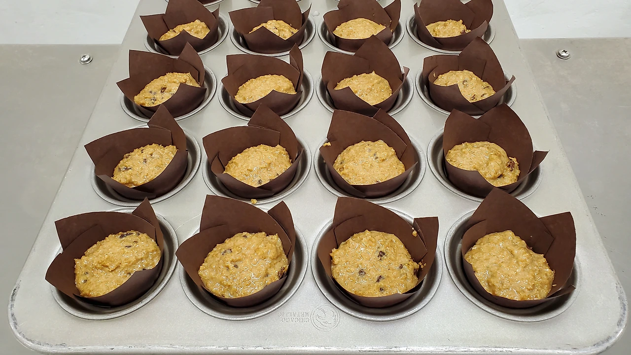베이킹 팬안의 종이컵에 머핀 반죽 (120g)을 넣은 모습
