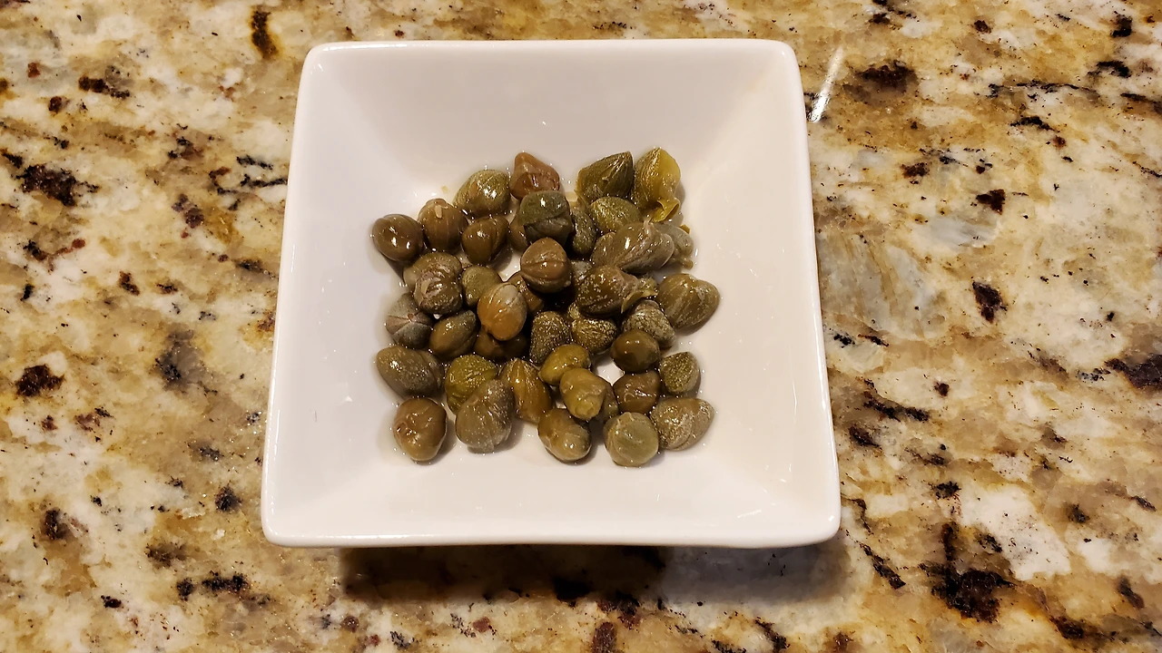 모든 드레싱 재료를 그릇에 담은 모습(왼쪽)과 케이퍼 (오른쪽)