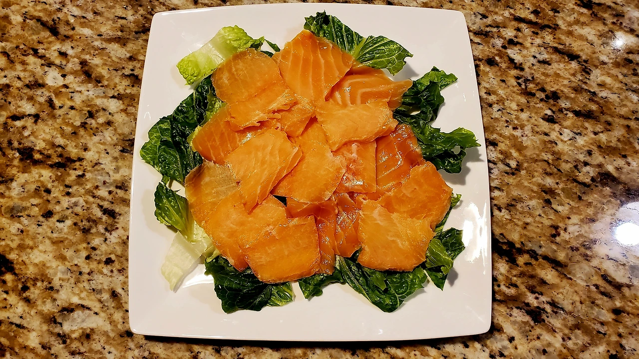 로메인과 슬라이스한 연어를 접시에 놓은 모습