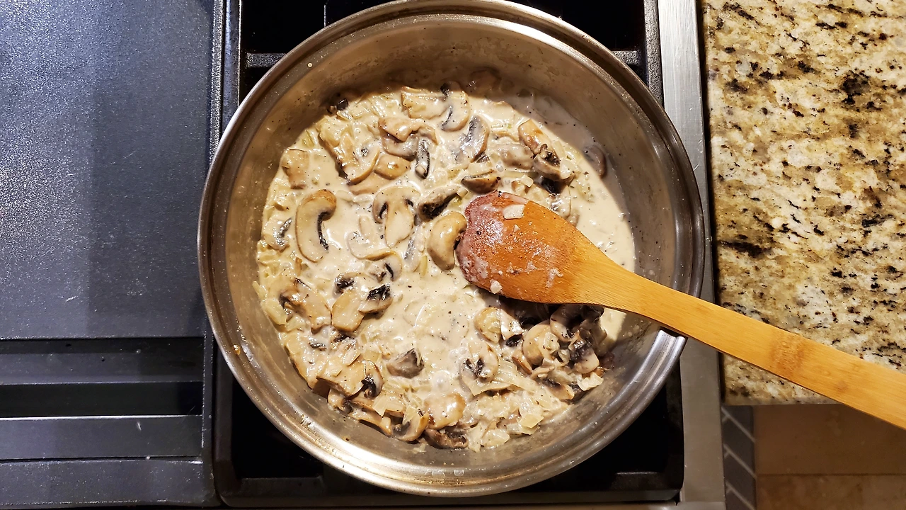4. 와인 (또는 물)과 크림을 넣고 5분간 끓이며 졸인 후 소금과 후추로 간을 하고 파슬리를 뿌려줍니다.