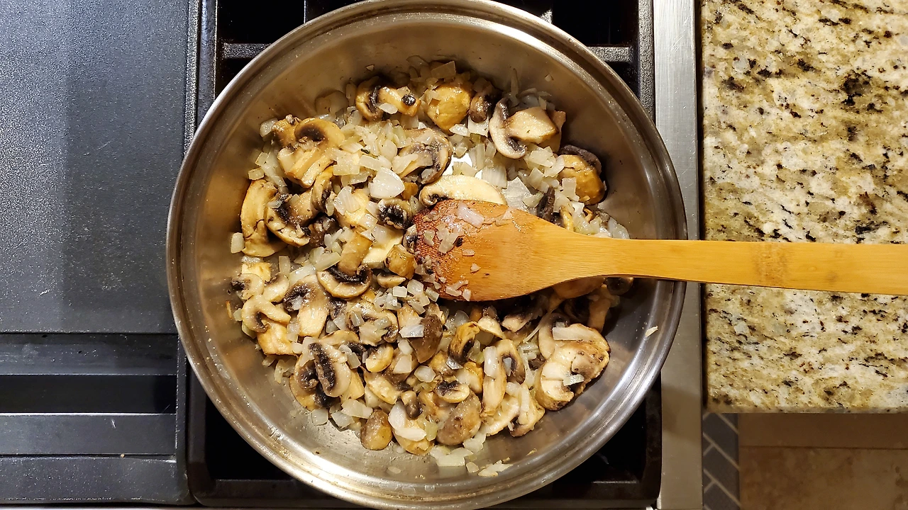 양파를 볶은 후 버섯을 넣고 볶아준 상태
