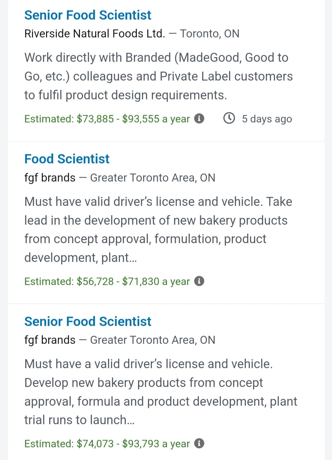Food Scientist의 구인 포스팅 (출처: workopolis)