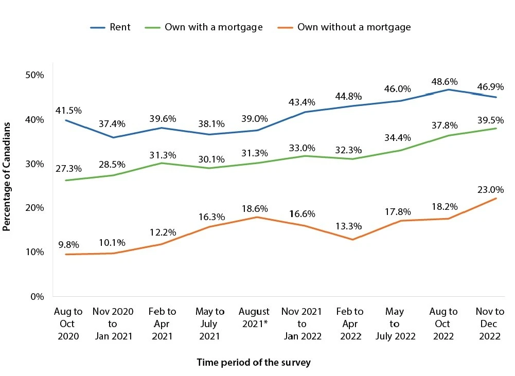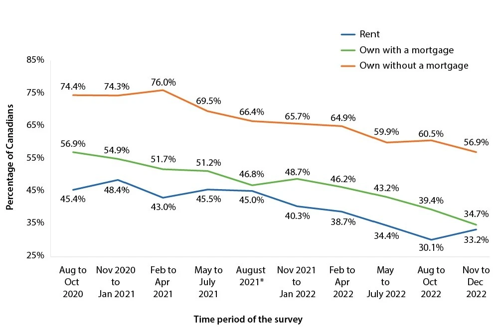 경제적 상황으로 인해 저축에서 돈을 찾아 사용해야 하는 모기지 보유자의 비율은 2020년 8월 이후 20% 포인트 증가했으며 현재는 임차인과 동일합니다. 수입보다 더 많이 지출하는 모기지 보유자의 비율은 조사가 시작된 이래(2020년 8월) 가장 높으며 캐나다 주택 소유자는 생활 비용을 충당하기 위해 점점 더 많은 대출을 받아야 합니다.