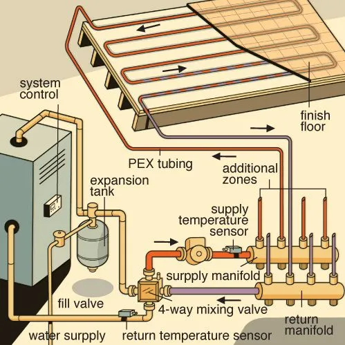 최근 변형된 방식으로 많이 사용되는 복사 바닥 난방 시스템 (floor radiant heating system)은 바닥을 통해 열을 전달하여 실내의 모든 차가운 물체와 사람에게 열을 방출하는 방식으로 편리함과 높은 연료 효율성으로 주목받고 있습니다. 이러한 순환수 난방 시스템은 깨끗하고 조용하며 다양한 재료의 바닥재를 설치할 수 있습니다. 주택뿐만 아니라 사무실, 창고와 차고에도 이 시스템을 사용할 수 있습니다.