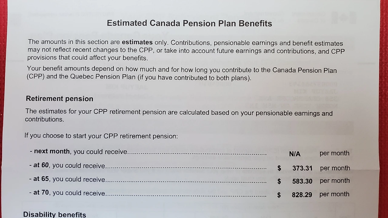 한국의 국민연금과 비슷한 개념으로 국가에서 운영하는 은퇴연금 플랜입니다. 캐나다 직장에서 2주마다 또는 월 2회 받게 되는 급여는 기본적으로 세금 (Tax), 캐나다 연금 플랜 (CPP), 고용보험료 (EI)가 공제됩니다. 연금은 보통 65세부터 받게 되는데 60세에도 미리 신청하여 받을 수 있지만 금액은 65세 때보다 줄어듭니다. 제가 정부로부터 받은 연금 설명서에 따르면 65세에 신청 시 $583.30로 되어 있는데 이 금액은 2001년부터 2027년까지 26년간 납부한 연금의 은퇴 후 수령액입니다.