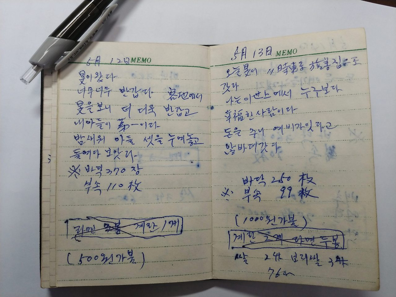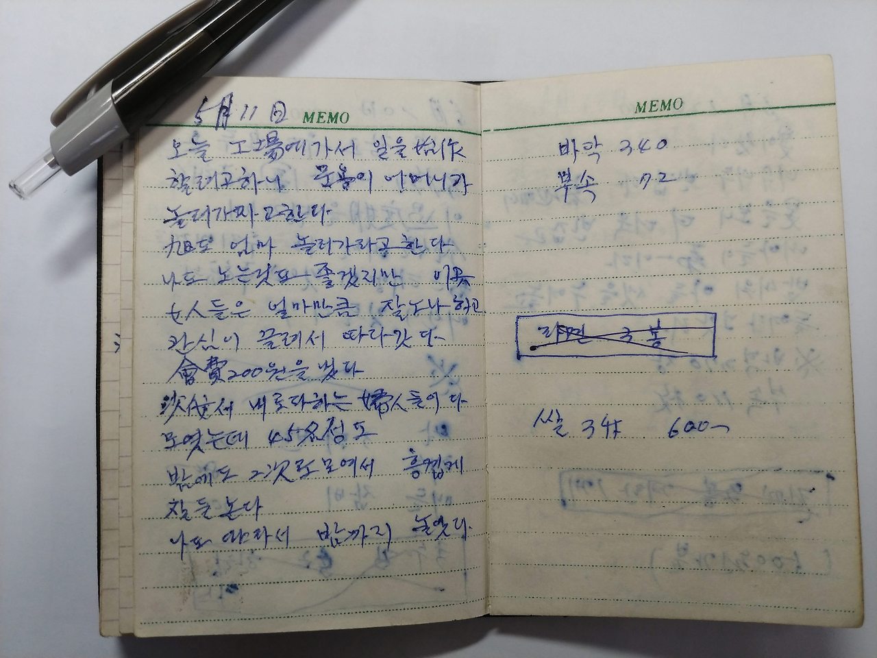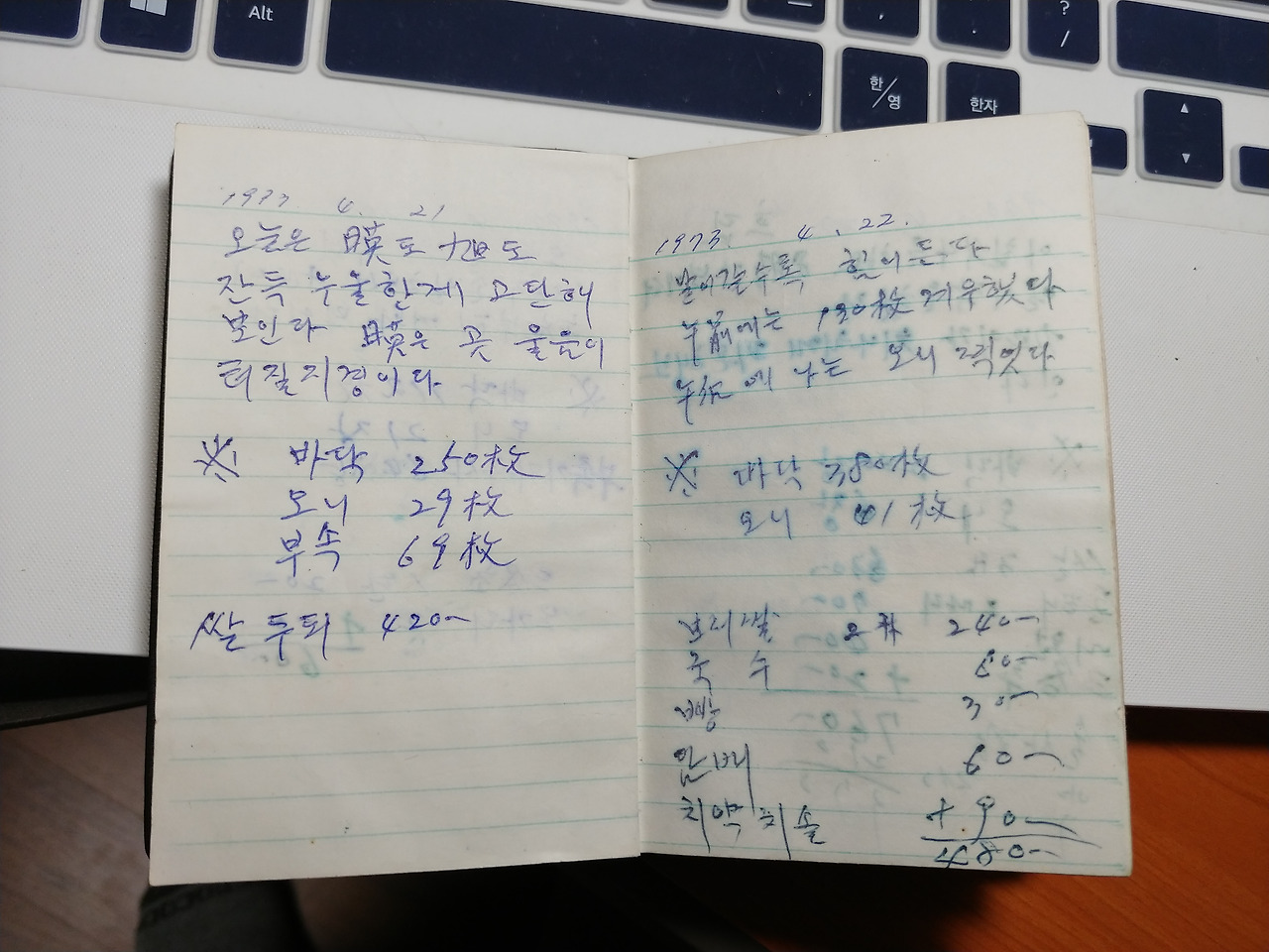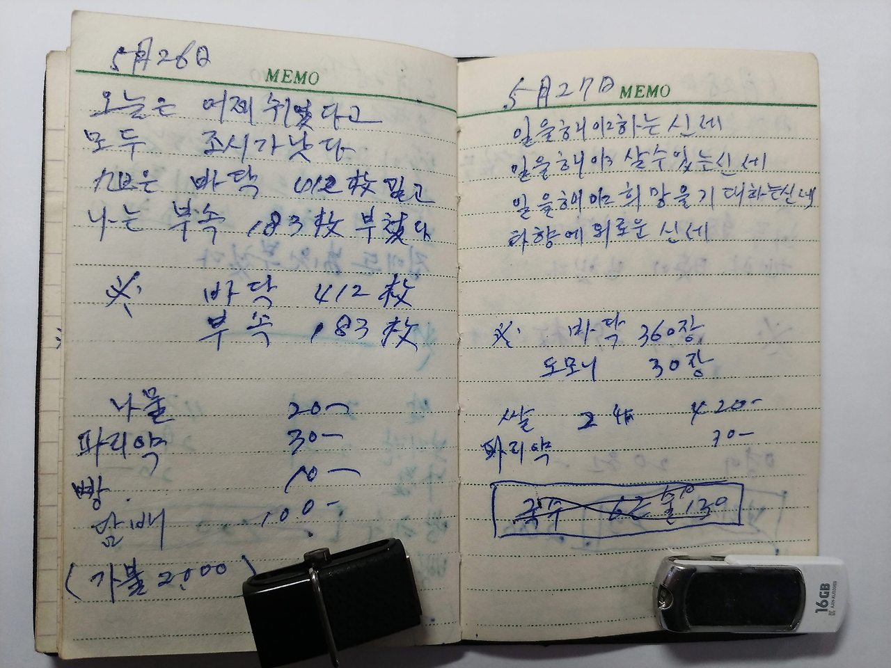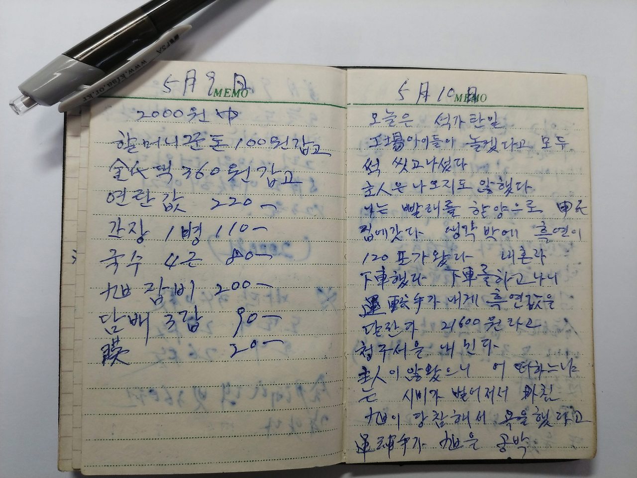 경북 상주 사벌면 낙동리 기와공장에서 막노동을 하면서 쓴 어머니의 일기장이자 가계부입니다.