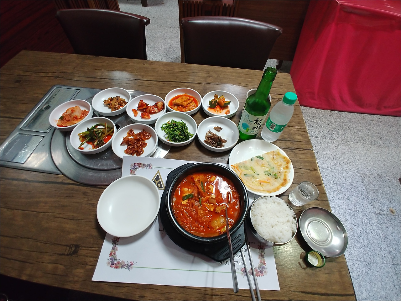첫날 도착해서 한국식당 가서 김치찌개에 소주 한 병 잘 먹은 큰일을 해냈고요,