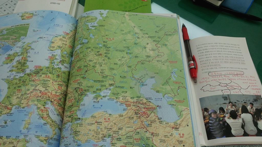 이병률을 읽다가 그루지아에서 아제르바이잔으로 가는 어느 저녁 무렵 국경 근처 기차역 풍경을 그려보기 위해 세계지리부도를 폅니다.