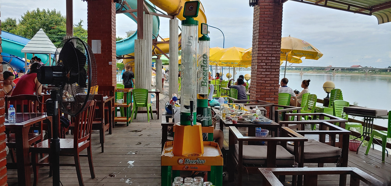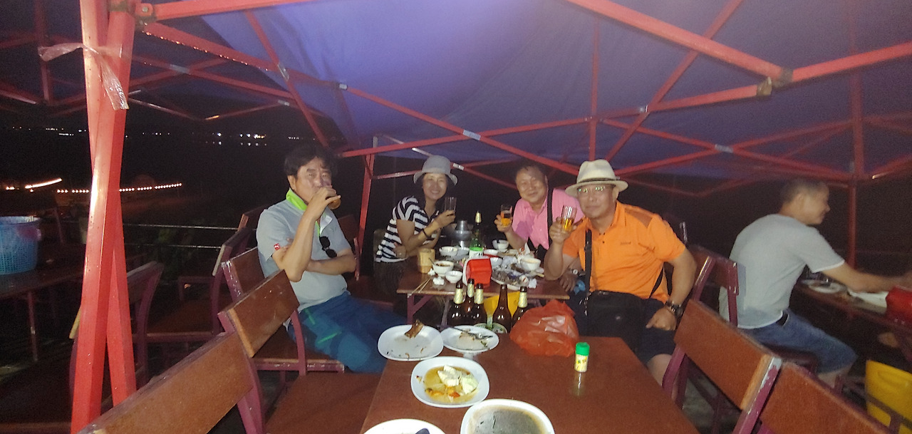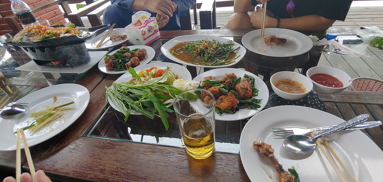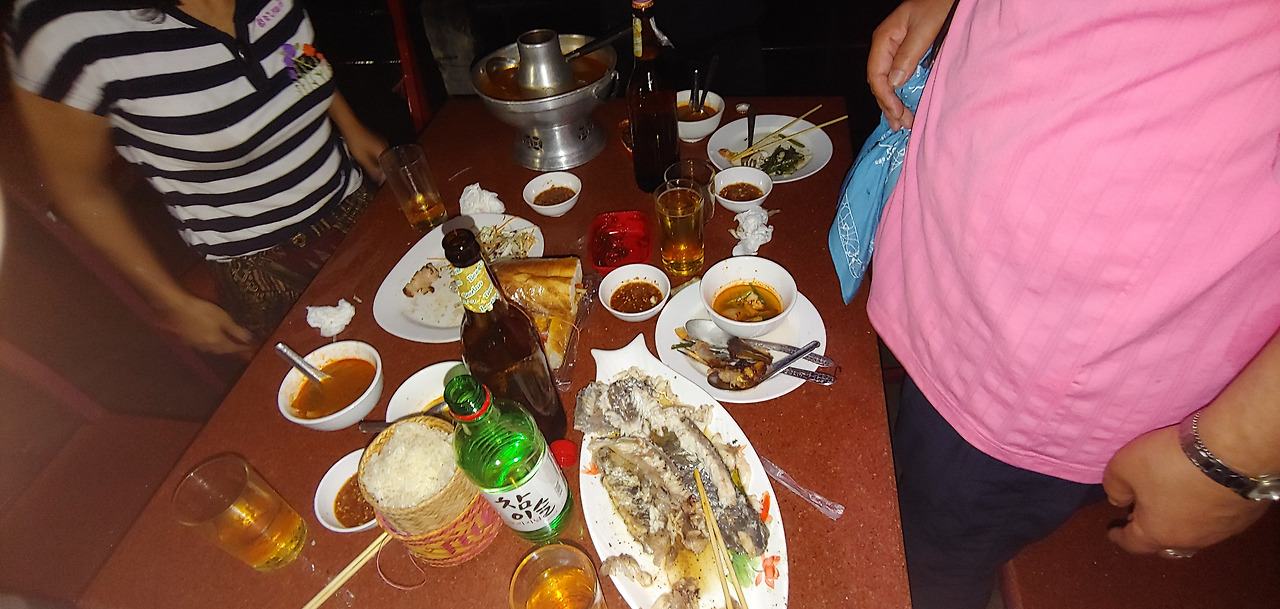 현지 식당에서 밥을 먹으며 가져온 소주와 비어라오를 나누어 마셨다.