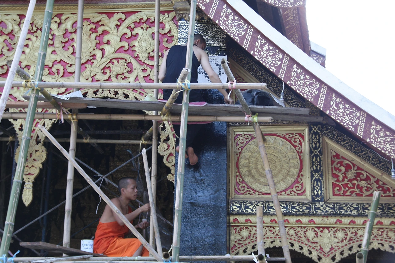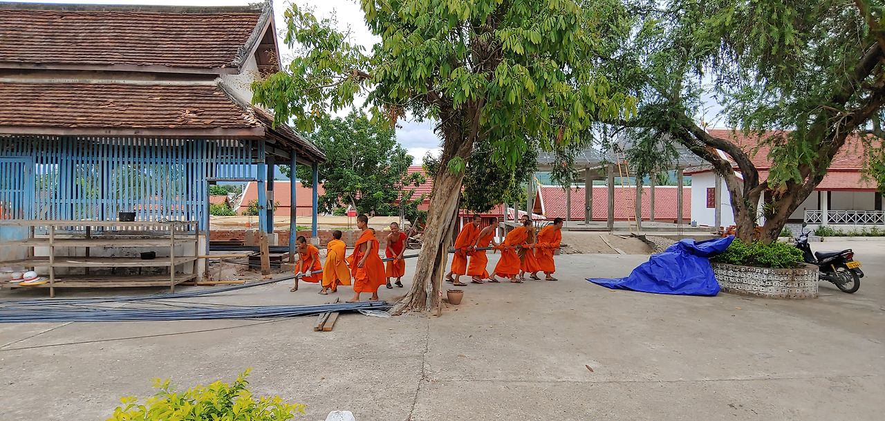 --왓 탓 루앙 사원을 둘러보는데 아이스님, 청년스님들이 철근 옮기는 작업을 하고 있었다.