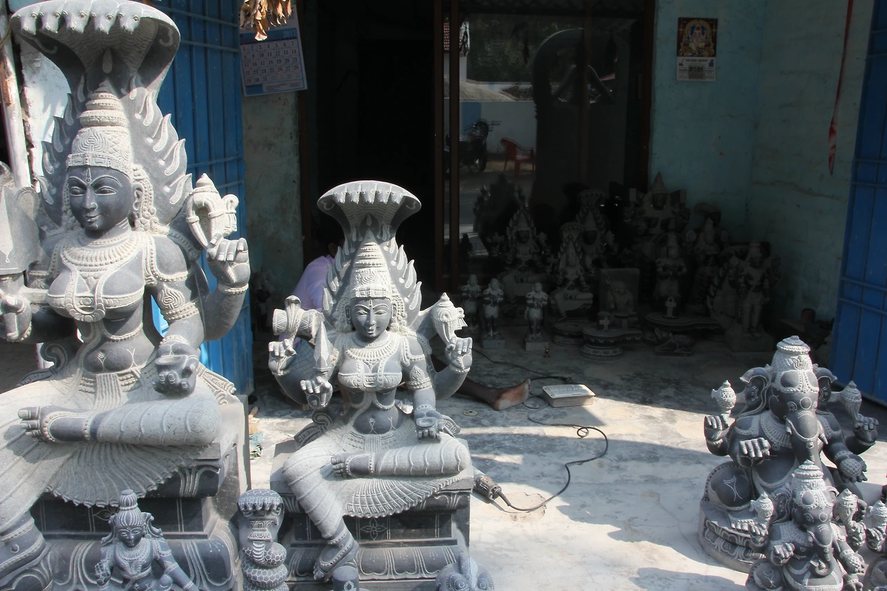 큰 사원은 쉬바 사원, 작은 사원은 비슈누 사원이다. 울타리에 조각된 소 형상과 무희들 형상이 특이하다.