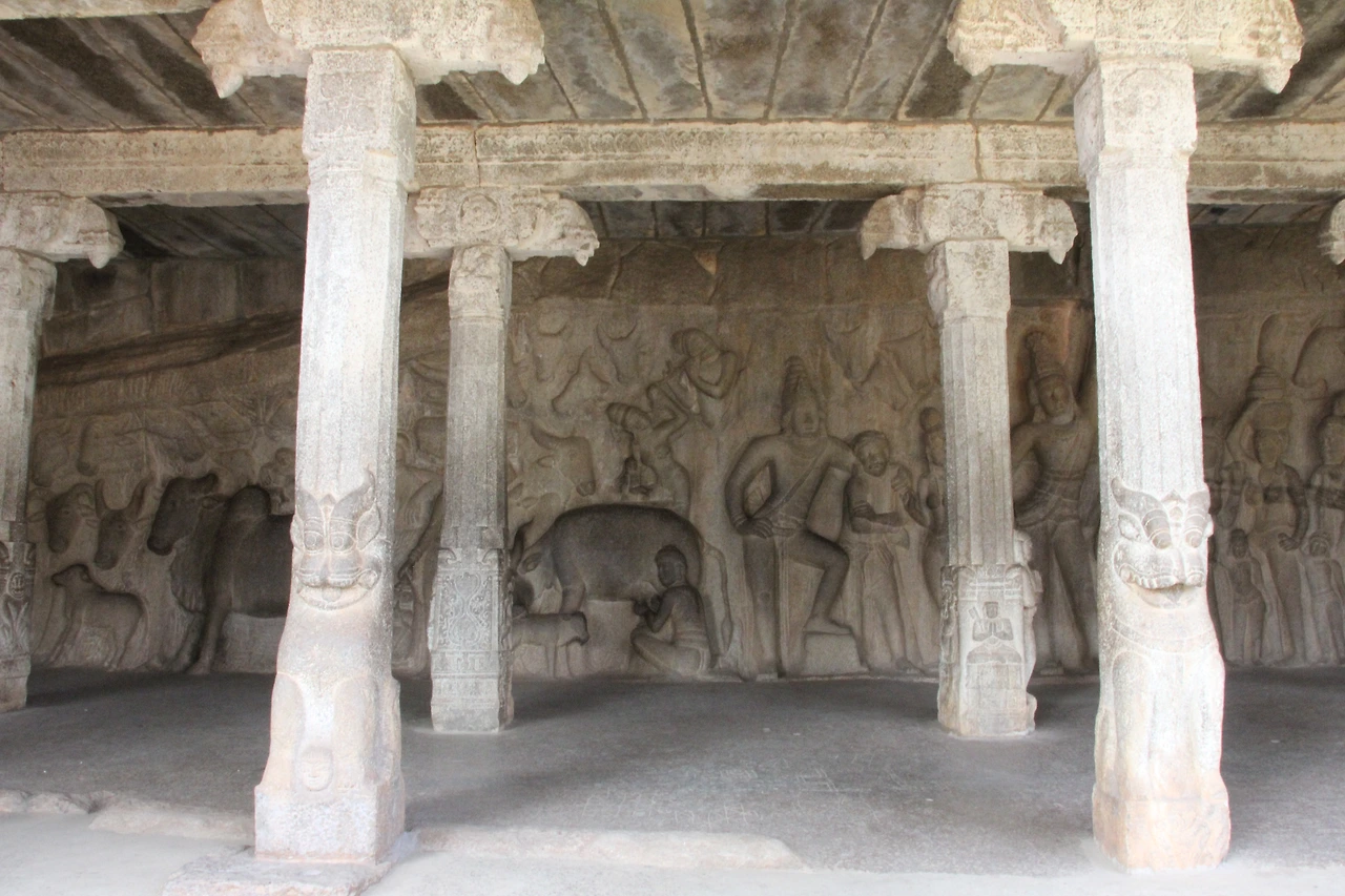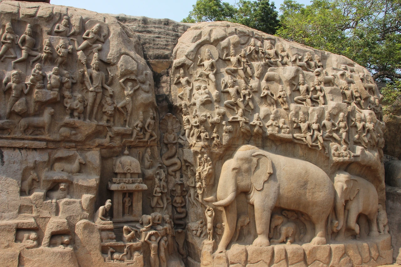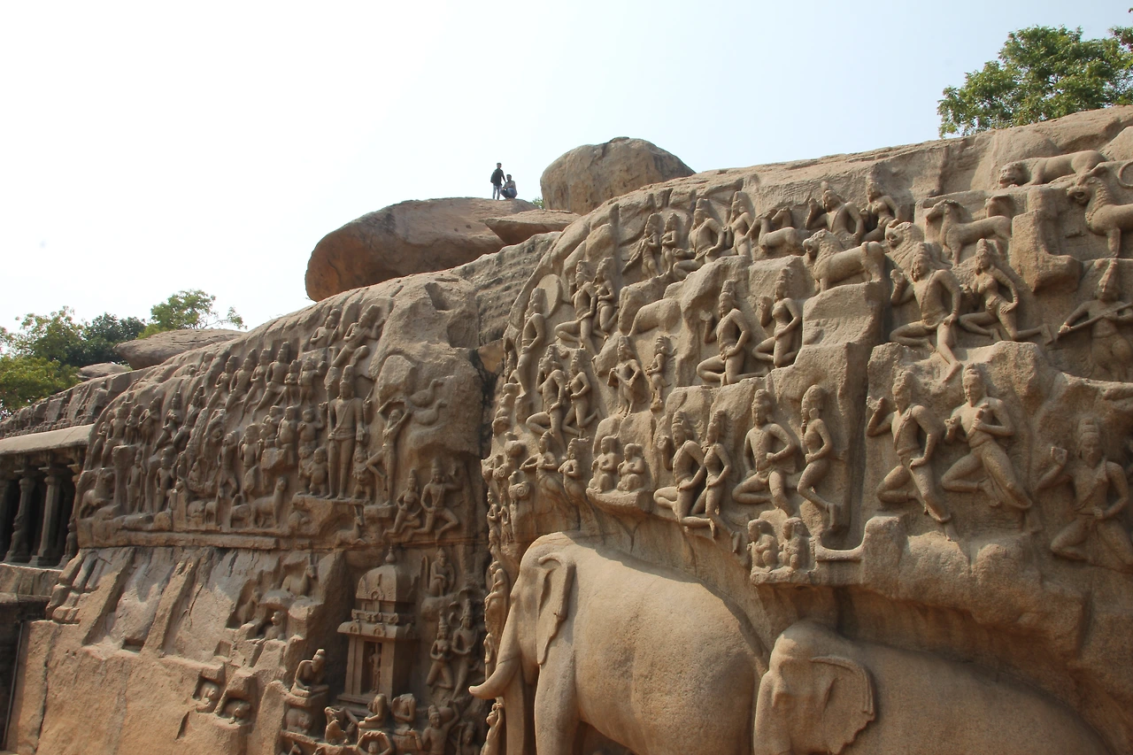 아르주나 고행상--높이 15m, 가로 29m로 큰 바위 하나를 모조리 깎고 다듬어 20여 명의 석공이 10년여에 걸쳐 완성한 것이라고 한다. 이 조각 전체를 "아르주나의 고행"이라고 부르는 설이 있는데 아르주나가 "마하바라타와" 와의 전쟁에서 이길 수 있도록 시바 신이 강력한 무기를 줄 것을 기원하면서 고행(고뇌)을 하고 있는 것이라고 한다. 왼쪽 윗 편에 보면 머리 위로 동그라미를 그리고 한쪽 다리를 들고 고행 중인 조각이 아르주나 고행상 좌측에 있던 바라하만다빰 바라하는 비슈뉴 신의 다른 모습을 뜻하는데 그는 파괴된 세상을 보존하는 역할을 한다. 동굴 안의 조각들은 재현된 우주의 모습을 그리고 있다고 한다.