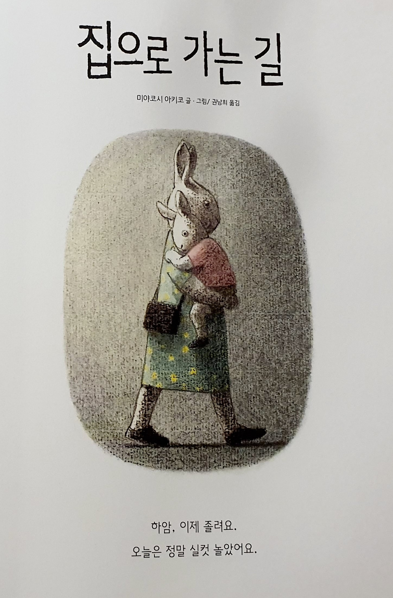그래서 엄마 품에 안긴 아이의 나른한 행복보다 아이를 안고 집으로 향하는 엄마의 고단함이 크게 보인다. 엄마는 아이를 따라다니느라 지쳤을 텐데 아이를 안고 밤길까지 걷고 있다. 늘 그랬다는 듯이 담담하다. 걸음에서 위대함이 느껴지지만 애잔함도 지울 수 없다. 집으로 향하는 엄마 토끼는 미소를 짓고 있지만 어둠과 묘하게 겹쳐 웃는 게 웃는 게 아닌 것도 같다.