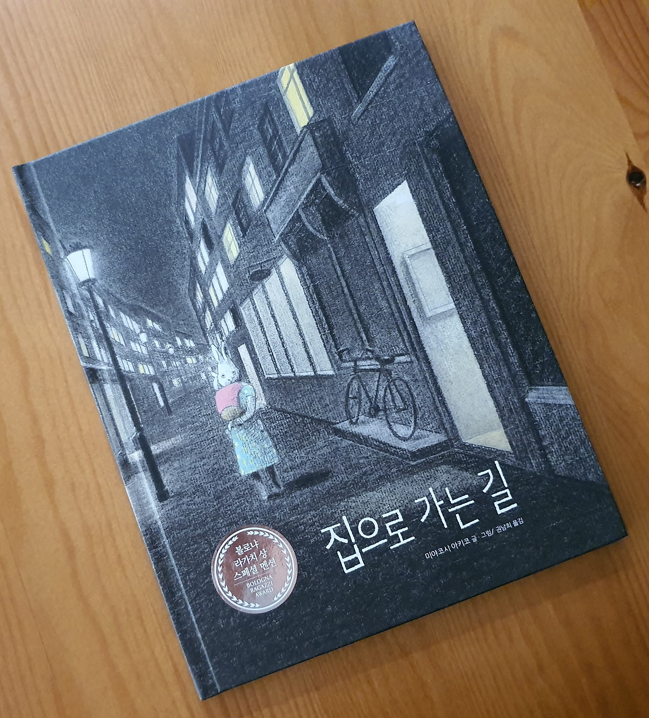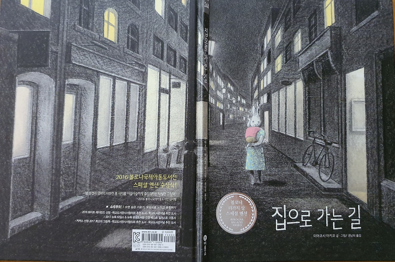 거리에 어둠이 짙다. 이 길에는 오직 엄마 토끼와 아기 토끼뿐이다. 엄마 토끼가 아기 토끼를 안고 있다. 엄마 토끼가 걷는지, 잠시 멈춘 건지 분명하게 알 수 없지만 뒤로 보이는 길을 보니 꽤 걸어온 듯하다. 아직 이 둘에게는 가야 할 길이 남아있다. 제목으로 짐작했을 때 집으로 가는 길이다. 엄마는 아이를 단단하게 안고 눈을 크게 뜬다. 무사히 집으로 가기 위해 다짐하는 것도 같고, 누군가를 발견하고 놀라는 것도 같다. 혹은 누군가를 찾기 위해 두 눈을 부릅뜬 것도 같다. 아기는 엄마에게 안겨 있다. 얼굴이 보이지 않아 표정을 알 수 없지만 불편하지는 않은 듯하다. 목탄의 질감이 거칠게 어둠을 표현했지만 『집으로 가는 길』의 표지 그림은 전체적으로 따뜻하다. 건물 창문의 노란빛이 이 둘이 가는 길을 밝혀준다. 집으로 가는 길이 험난하지는 않겠다.