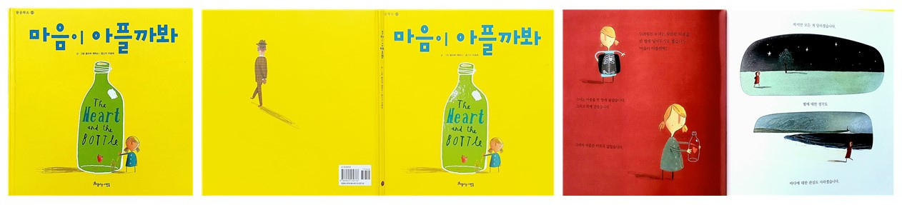 『마음이 아플까 봐』의 소녀는 세상에 대한 호기심이 많습니다. 소녀의 머릿속은 밤하늘의 별과 바다에 대한 신비로움으로 가득 차 있죠. 소녀는 새로운 것을 아는 게 기쁩니다. 할아버지의 빈 의자를 보기 전까지는요. 할아버지를 잃은 소녀는 마음이 아플까 봐 자신의 마음을 빈 병에 넣습니다. 그러자 마음이 아프지 않습니다. 마음은 안전한데 별과 바다와 세상에 대한 관심이 없어집니다. 호기심이 많던 소녀는 더 이상 궁금한 것도, 기쁜 것도, 슬픈 것도 없어지지요. 얼굴에는 표정이 사라지고 무엇을 해야 할지도 모르겠습니다.