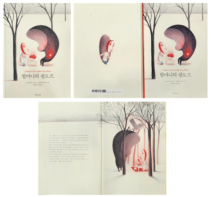 이탈리아의 베파나 전설을 모티브로 한 『할머니의 팡도르』는 붉은색과 검은색이 여백과 조화를 이루며 전체적인 분위기를 끌고 갑니다. 둥근 몸을 한 사신은 기묘하게 생겼는데 부드럽고 포근하고 우스꽝스러워서 위압감은 조금도 없습니다. 사신은 냉정하고 무서울 거라는 선입견을 깨고 너무나 순수하고 순진해서 보는 내내 웃음이 나오죠. 자꾸만 죽음을 연기하는 할머니는 뻔뻔과는 거리가 멉니다. 너무나 다정하고 당당해서 사랑스럽습니다. 삶에 대한 미련이나 죽음에 대한 두려움이 아닌, 자신의 빵을 먹고 행복해할 아이들을 위하는 마음이 고스란히 느껴져 할머니의 삶이 지속되었으면 하죠. 계속 이어질 생명들을 위해 자기만의 비법을 남긴 그 마음이 온기에 온기를 더합니다. 빵이 특별한 이유는 기술보다는 할머니의 사랑과 애정이 담겨있기 때문입니다. 그녀의 레시피에는 어떤 마음으로 빵을 만들어야 하는지, 어떤 방식으로 삶을 대해야 하는지 등도 포함되었겠죠.
