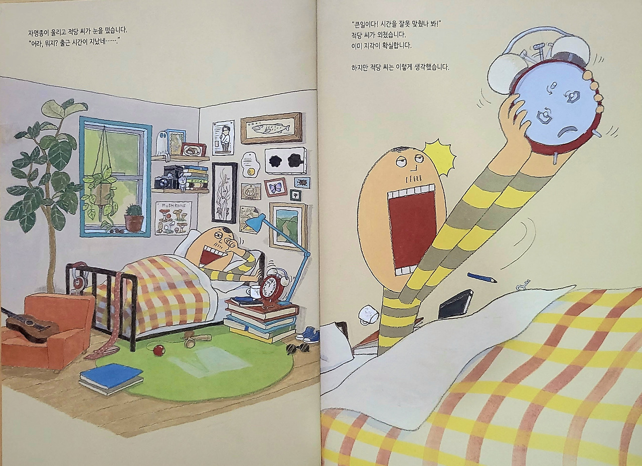 적당 씨의 집에는 선인장을 비롯해 몇 가지 종류의 식물들이 자라고 있다. 어느 것 하나 시들지 않고 싱싱하다. 부지런해야 가능하다. 자명종 소리에 깬 적당 씨는 시간을 확인하고 무척 놀란다. '또 지각이다'라는 말이 없는 걸 보면 이런 일이 처음인가 보다. 혹은 아주 드문 일이거나. 지각을 하더라도 회사는 가야 한다고 말할 수 있는 건 성실함과 책임감이 있기 때문이다. 그의 집을 채운 기타, 사진기, 책, 액자 속 사진과 그림 등을 통해 그가 일 뿐 아니라 취미생활도 열심히 즐기고 있음을 알 수 있다. 반려견 사진과 가족사진을 집안 곳곳에 두고, 꽃을 보면서 행복해하는 적당 씨는 무척 낭만적이고 사랑이 넘친다. 가방과 옷까지 잃었지만 포기하지 않고 목적지에 도착한 그는 끈질기고 끈기 있는 사람이기도 하다. 이런 적당 씨를 마냥 한심하게 볼 수는 없다.