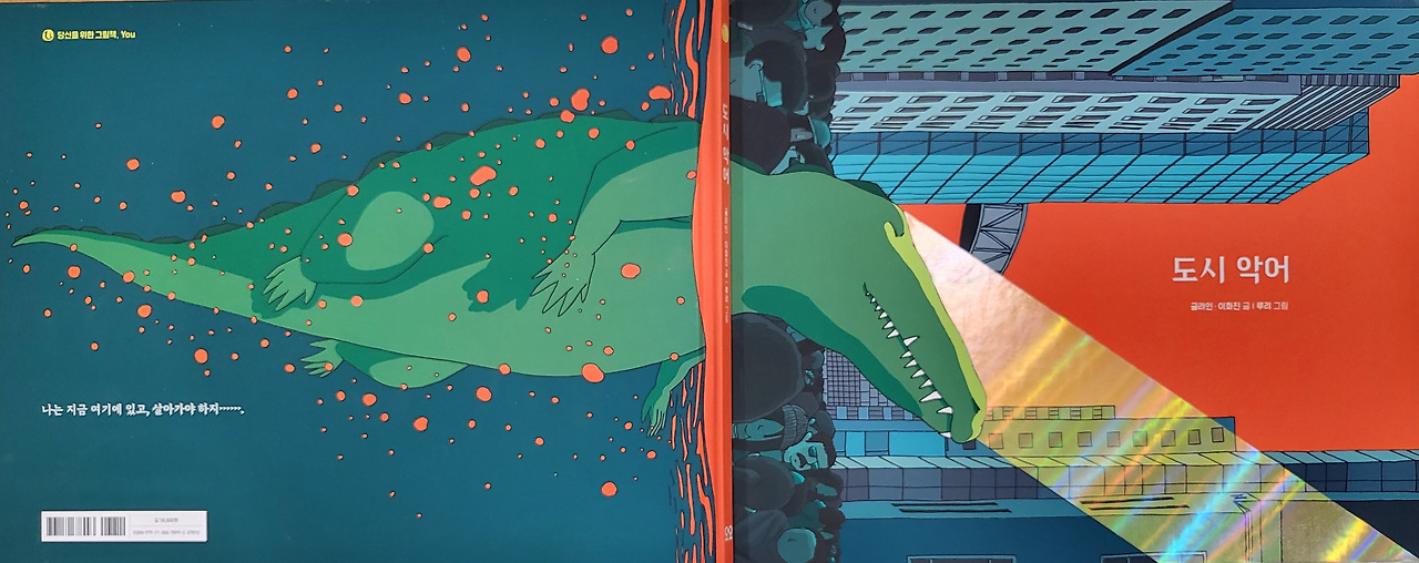 앞표지와 뒤표지의 배경이 왜 다른지 알겠네요. 책을 다 읽은 후 당신이 다시 표지를 본다. 앞표지는 높은 빌딩 아래 무표정이거나 눈코입이 없는 사람들이 모여 있는 도시가 배경이고, 뒤표지는 물속이 배경이다. 악어의 상반신은 도시에, 하반신은 물에 있다. '나는 지금 여기에 있고, 살아가야 하지……'라는 문장이 책을 읽고 나니 가슴을 세게 친다고 당신이 말한다. 잔뜩 주눅이 들어 슬픈 표정을 짓던 악어가 표지에서는 만족스러운 듯 웃고 있어서 다행이라는 말도 덧붙인다. 다행이긴 한데 ……. 당신이 말끝을 잇지 못한다.