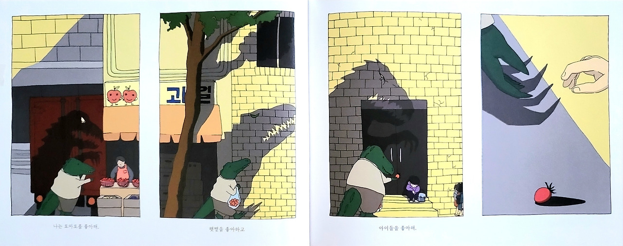 도시에 사는 악어는 사람들과 어울리기 위해, 그들에게 인정받기 위해, 적어도 혐오와 무시를 받지 않기 위해 옷을 입고, 두 발로 걷고, 피부를 관리하고, 이빨을 다듬고, 꼬리까지 자르려 한다. 악어는 자신이 악어라는 사실을 잊은 채 사람들의 기준에 맞추려 노력하고, 그때마다 좌절한다. 악어가 자신을 부끄러워하는 건 당연하다고 당신이 말한다. 타인의 시선이 정체성 형성에 어떤 영향을 미치는지도 설명한다. 사람들이 악어를 받아들이지 못하는 것도 당연하단다. 당신은 악어의 진심을 보지 못하는 이들을 비난할 수 없다며 악어의 실제 모습과 그림자가 다른 장면을 펼친다. 사랑이 넘치든, 마음이 여리든 사람들에게 악어는 악어예요. 도시에서 악어는 환영받기 힘들죠. 당신이 한숨과 함께 안타까움을 내뱉는다.