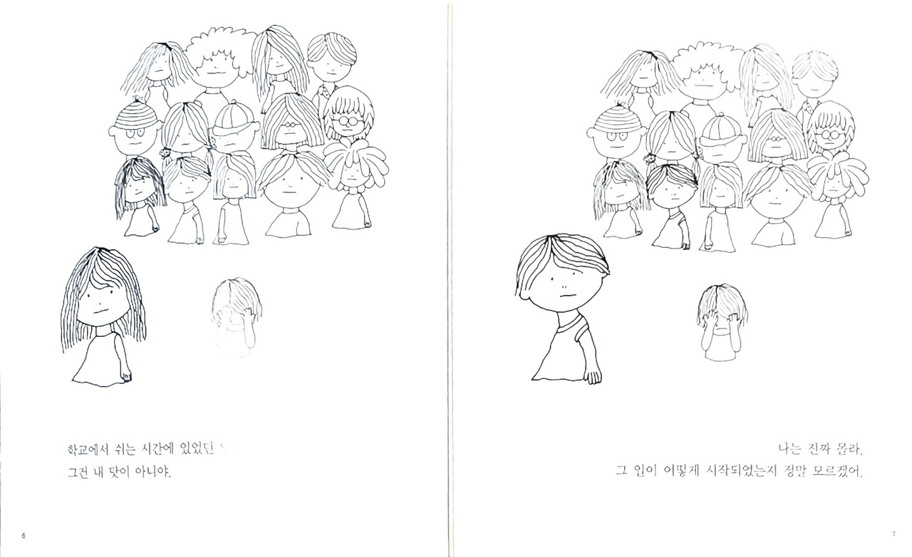 방관을 한 아이들도, 가해를 한 아이들도 모두 자기 탓이 아니라고 합니다. 몇 명은 오히려 피해자가 잘못했다면서 자기들의 폭력을 정당화합니다. 폭력을 당한 아이는 두 손으로 얼굴을 가리고 눈물을 흘리고 있는데 누구도 사과하지 않습니다. 반성은 없고, 지금 이 순간만 모면하려 하지요.