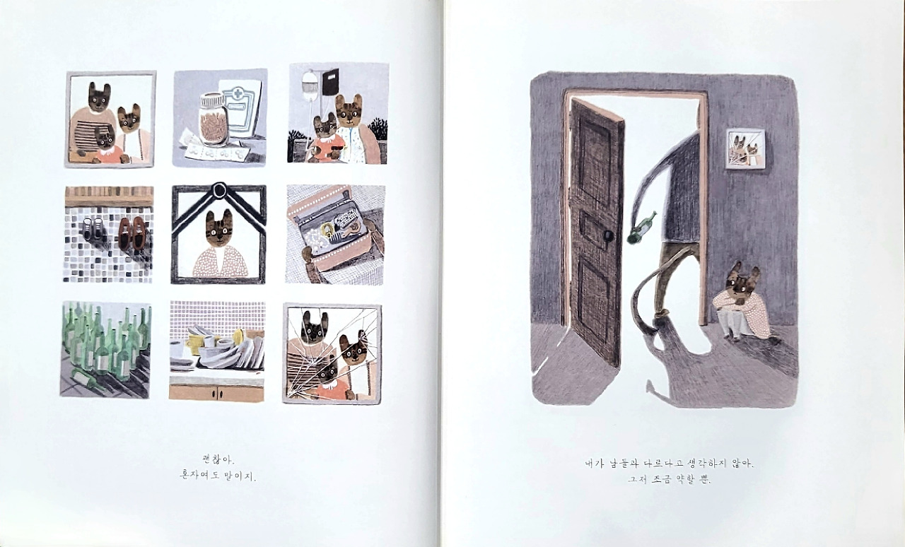 일반적인 그림책이 40~50쪽 정도라면 『있잖아, 누구씨』는 136쪽이다. 두께도, 무게도 꽤 된다. 내용도 무겁고, 묵직하다. 표지 그림은 홀로 서 있는 고양이와 그의 그림자가 전부다. 다문 입술, 동그랗게 뜬 눈, 세로로 긴 동공을 보니 슬픈 것도 같고, 두려운 것도 같다. 고양이 앞에 드리운 그림자는 뒤표지로 이어진다. 하얀 여백에 자신의 그림자와만 연결된 고양이가 누구씨를 부르는 건지, 이 고양이를 누구씨라고 부르는 건지 알 수 없다. 표지를 넘기니 회색 면지에 고양이 사진 한 장이 있다. 어린아이처럼 보인다. 무표정한 얼굴에 어딘가 얼어붙은 자세가 앞표지의 고양이와 똑같다. 사진 속 고양이 뒤로 알 수 없는 형체의 무늬가 있다. 그게 무엇인지 아직은 알 수 없지만 어떤 의미가 있는 듯하다. 시계, 목걸이 등이 담긴 상자가 그려진 속표지를 지나니 본격적인 이야기가 시작된다. 왼쪽 장은 온통 백지이다. 오른쪽 장의 그림도 불필요한 배경을 생략하고 여백을 두었다. 그래서 벤치에 앉아 아이와 눈을 맞추며 카메라를 가리키는 엄마, 엄마의 무릎 위에서 입술을 벌리고 웃는 아이, 그 뒤에서 흐뭇하게 미소를 짓는 아빠에게 집중할 수 있다. 다음 장은 앞 장과는 다른 분위기다. 9컷의 그림은 그동안 이 가족에게 무슨 일이 일어났는지 순차적으로 보여준다. 앞 장에서 찍은 가족사진, 약봉지, 병원에 입원한 엄마, 현관에 놓인 아이와 아빠의 신발, 엄마의 영정 사진, 보석 상자, 엄청난 양의 소주병, 개수대에 쌓인 그릇들, 깨진 액자 속 사진 아래로 '괜찮아. 혼자여도 말이지.'라는 문장이 아프게 다가온다.