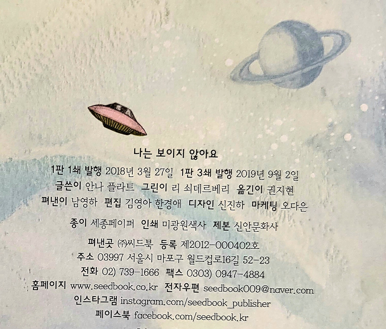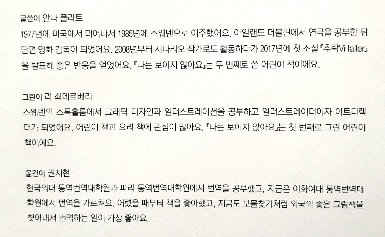 * 『나는 보이지 않아요』, 안나 플라트 글, 리 쇠데르베리 그림, 권지현 옮김, 씨드북 펴냄