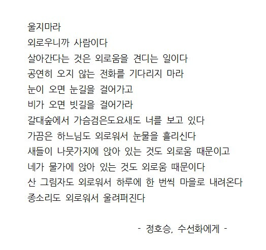정호승 시인의 시 <수선화에게>에는 '외로우니까 사람이다'라는 구절이 나온다. 이 시는 살아가는 것은 외로움을 견디는 일이라며 외로움은 인간의 숙명이며 본질이라 말한다. 오지 않는 전화를 기다리지 말고, 눈이 오면 눈길을 걷고, 비가 오면 빗길을 걸으라며 냉정하게 말하다가도 갈대숲에서 가슴검은도요새가 너를 보고 있다며 위로를 건네기도 한다. 하느님도, 새들도, 산 그림자도, 종소리도 외롭다는 시를 읽으면 나 혼자만 그런 게 아니라는 안도감을 느낀다. 정리하자면 <수선화에게>는 혼자라 느끼는 이들을 위로하면서 외로움은 인간의 숙명이며 삶의 본질이라 말하고 있다.
