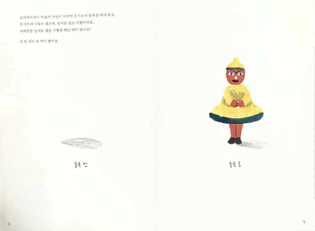 로카페르페타 마을 사람들은 자신의 존재를 타인에게 증명받아야 한다. 등록증이 없으면 있어도 없는 사람일 뿐이다. 그림은 등록 전과 등록 후를 비교해서 보여준다. 등록 전에는 회색의 선들로만 이루어진 그림자이지만 시쿠리니 씨가 등록증을 건네는 순간부터 모습을 갖게 된다. 마을 사람들은 인간의 모습만 하고 있지 않다. 바다생물도 있고, 인어도 있고, 재미있는 모양의 생명체도 있다. 이들은 모두 개성 있는 생김새를 갖고 있고, 다양한 역할과 성격을 갖고 있지만 이 마을은 그것을 인정하지 않는다. 마리오는 '오븐에 감자 굽는 사람'만은 아닐 텐데 그는 그런 사람이 되어 평생을 살아가야 한다. 타인에 의해 짧은 한 줄로 자신이 정의되는데도 이들은 불만이 없다. 권위에 맞서지 않고 주어진 대로 살아가는 사람들만 있는 마을에 내맘대로 초등학생 아이들은 희망이다. 그들은 자신의 강점과 특징이 무엇인지 알고, 다양한 취미를 갖고 있으며, 목이 아프다는 사실도 숨기지 않고 말한다. 타인에게 자신의 가치를 맡기지 않고, 스스로를 알리면서, 자신의 다양한 면을 받아들인다. 등록증이 없기에 '있어도 없는 거나 마찬가지'였던 아이들이 단정한 마을의 틀을 깨뜨리며 그들의 존재를 증명하고 있다.
