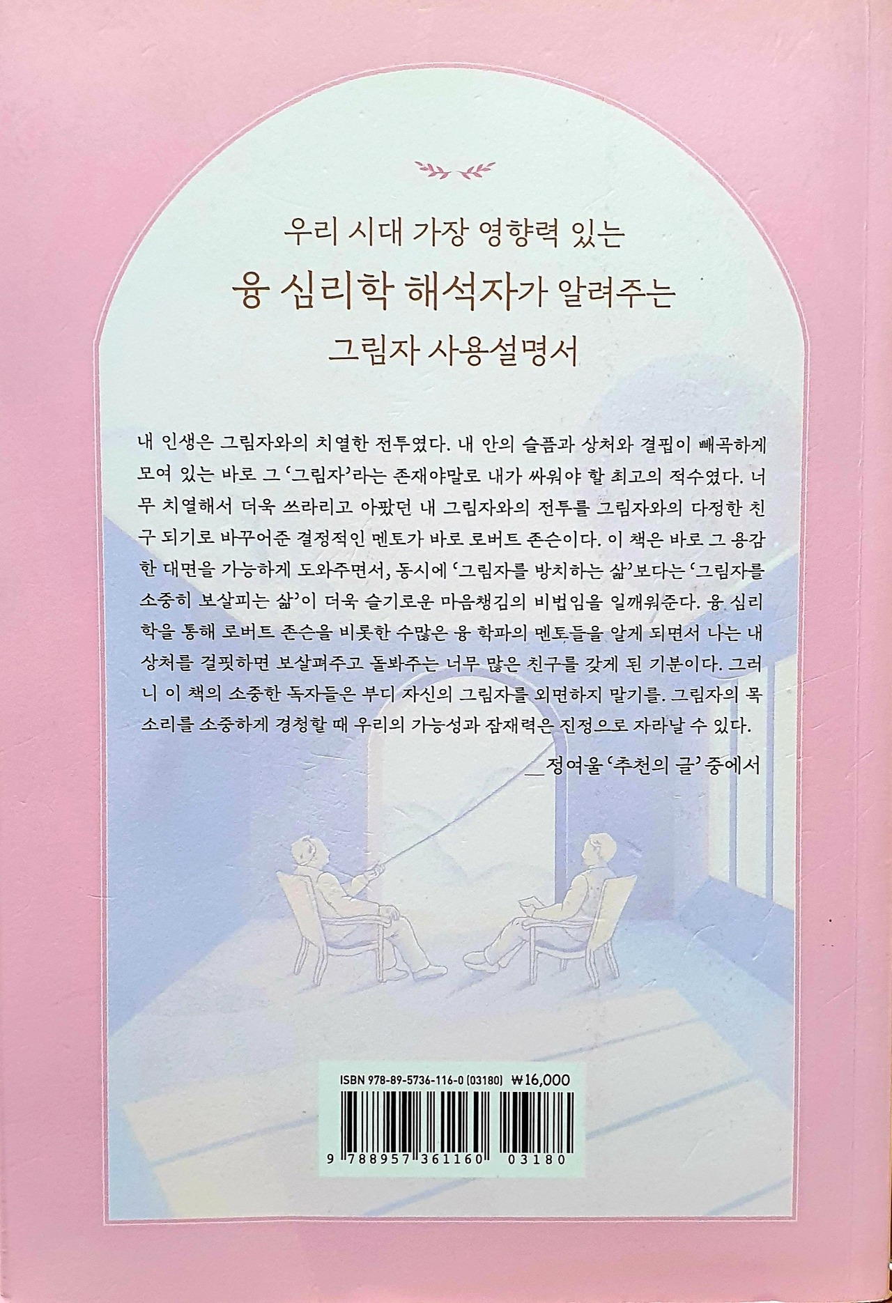 내 인생은 그림자와의 치열한 전투였다. 내 안의 슬픔과 상처와 결핍이 빼곡하게 모여 있는 바로 그 '그림자'라는 존재야말로 내가 싸워야 할 최고의 적수였다. 그런데 내 안의 그림자를 깊이 들여다볼수록 '그림자와의 전투'는 점점 '그림자와 친구 되기'라는 정반대의 경지를 향해 달려가고 있다. 너무 치열해서 더욱 쓰라리고 아팠던 내 그림자와의 전투를 그림자와 다정한 친구 되기로 바꾸어준 결정적인 멘토가 바로 로버트 존슨이다. 융 심리학의 다정한 안내자이자 고통받는 사람들의 따스한 멘토, 로버트 존슨은 어렵고 힘들게만 느껴졌던 융을 내 곁의 가장 가까운 스승으로 만들어주었다.