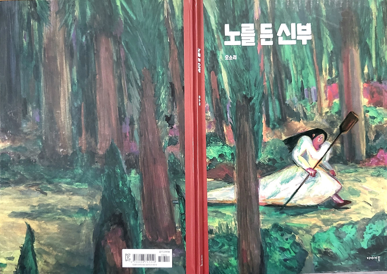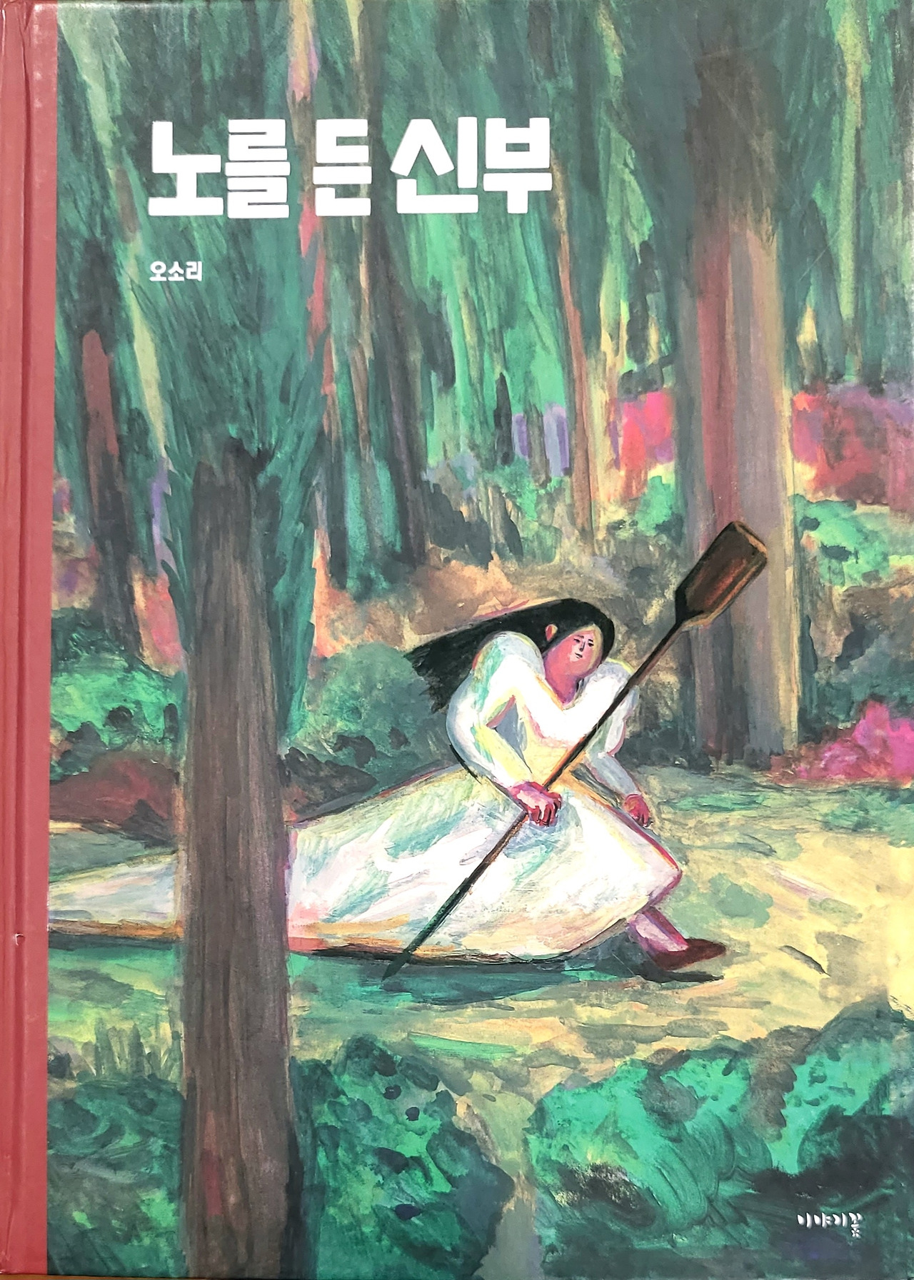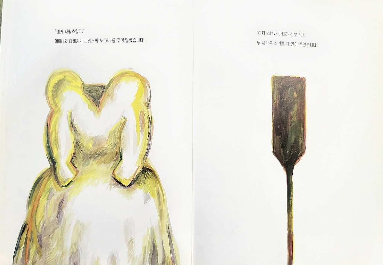 노 하나로는 배를 탈 수 없다는 얘기를 들었다면 저는 분명 절망했을 겁니다. 노를 하나밖에 주지 않은 부모를 원망했을 것이고, 왜 내게는 노가 하나밖에 없냐며 슬퍼했겠지요. 노 하나로 할 수 있는 게 무엇인지 생각하기 전에 쓸모없는 물건이라며 버렸을 수도 있어요. 혹은 나머지 하나를 얻기 위해 수많은 것들을 포기했을지 모르고요. 하지만 이 그림책의 주인공은 다릅니다. 어깨가 과하게 부푼 소매와 치마가 너무 길어 거추장스러운 드레스를 입고도 씩씩합니다. 가진 게 없어 안 된다는 말을 들어도 좌절하지 않고 자신이 탈 수 있는 배를 찾지요. 아니다 싶으면 당당하게 거부하기도 하고요. 그러다 노의 쓰임을 발견하고, 여기에서 더 확장해서 사용합니다. 신부는 남들이 정해주는 길이 아닌 자신이 원하는 길을 향해 나아갑니다. 끝까지 유쾌하고 거침없이 자신의 욕구에 충실하죠. 당당하게 세상과 마주한 주인공의 성격처럼 그림도 시원시원합니다. 굵직한 선은 거침이 없고, 색도 강렬합니다. 아쉬운 점이 있다면 주인공을 '신부'라는 호칭에 가두고 싶지 않은데 끝까지 그녀는 신부로 불리네요.