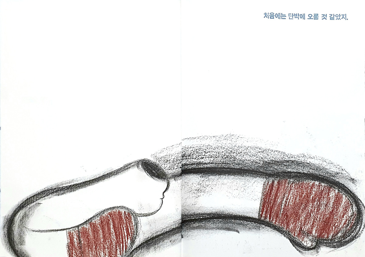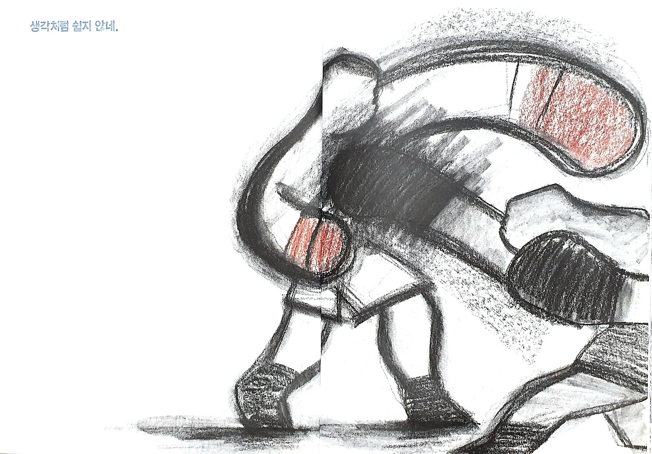 링 위에서 벌어지는 결투는 방어할 수 없을 만큼 훅, 들어와 마음을 강타합니다. 목탄화로 거칠게 그린 싸움은 너무 처절하고 치열합니다. 배경을 과감하게 삭제하고 두 선수의 모습만 투박하게 그렸기에 이들의 싸움에 집중할 수밖에 없습니다. 단박에 오를 줄 알았던 산은 생각처럼 쉽지 않고 예상하지 못한 골짜기, 바위, 웅덩이 등이 나오듯이 금방 끝날 줄 알았던 링 위에서의 싸움도 지난합니다. 한 대 맞았는데 또 주먹이 날아옵니다. 이제는 일어서는 것도 쉽지 않습니다.