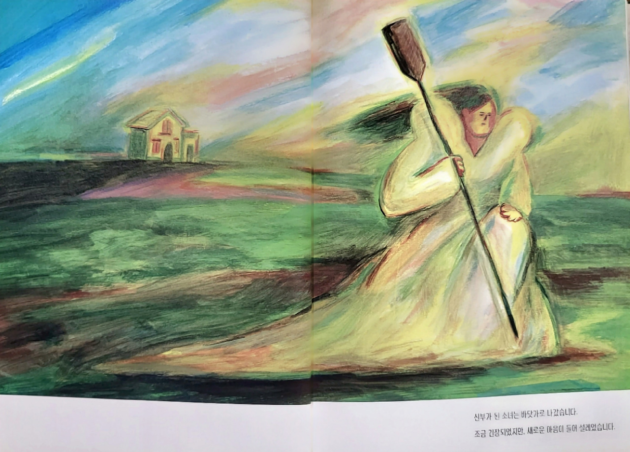『노를 든 신부』의 소녀는 노 한 자루와 드레스 한 벌만으로 집을 나섭니다. 친구들이 신부와 신랑이 되어 섬을 떠났으니 소녀 역시 신부가 되기로 결심합니다. 신부는 잔뜩 기대를 하고 바닷가로 가지만 노가 하나밖에 없어 배를 타지 못합니다. 신부는 자신을 태워줄 배를 찾지 못하자 바닷가를 떠나 산으로 갑니다. 그곳에서 자신을 태워줄 배를 만나지만 이번에는 신부가 거부합니다. 그 배들을 탈 바에는 차라리 심심한 게 낫다면서 말이죠. 그러다 늪에 빠진 사냥꾼을 만납니다. 신부는 사냥꾼 덕에 자신의 노가 쓸모 있음을 깨닫습니다. 이제 노는 배를 타기 위해 필요한 도구가 아닙니다. 노로 과일을 딸 수 있고, 요리를 할 수 있고, 결투도 할 수 있죠. 신부는 자신이 갖고 있는 노 한 자루를 잘 활용해 새로운 도전을 합니다.